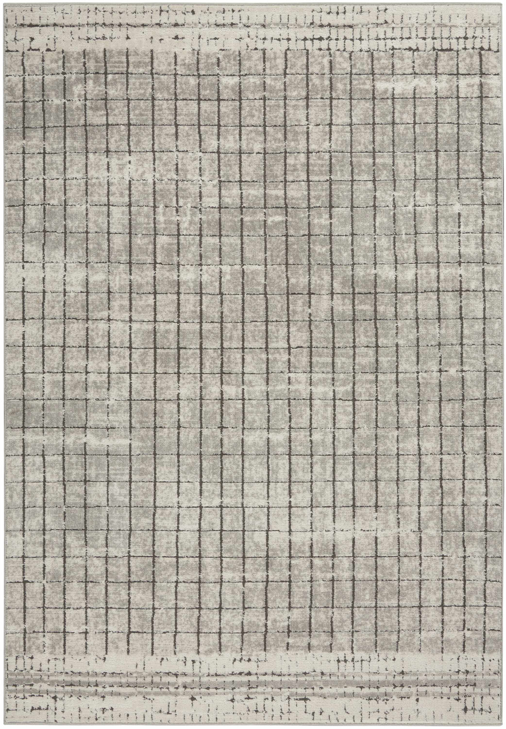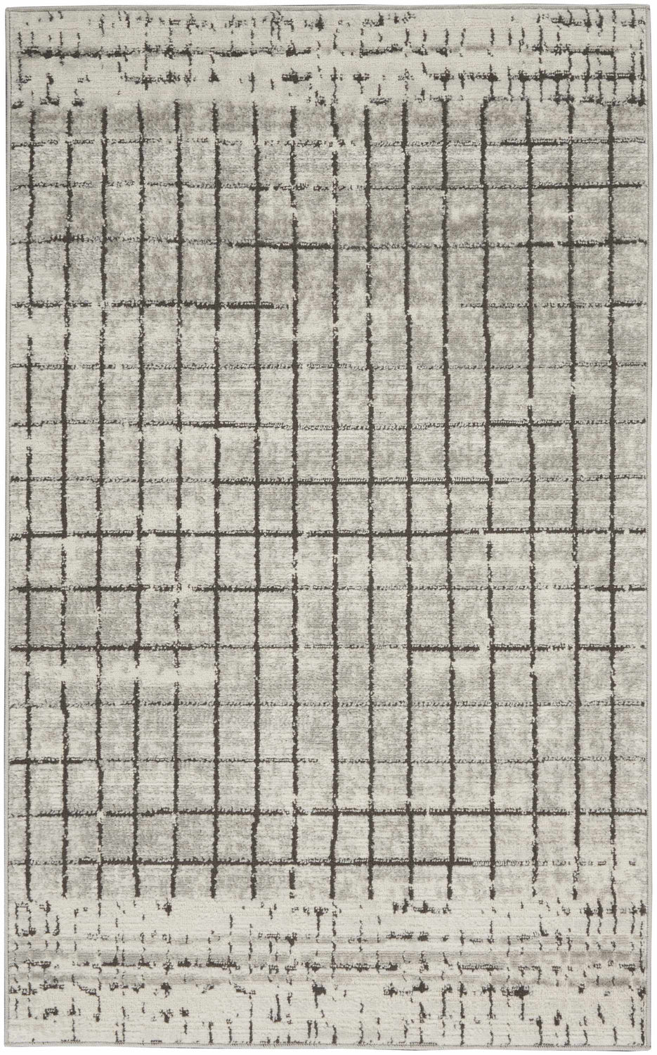 - Soft ivory base with charcoal distressed grid pattern