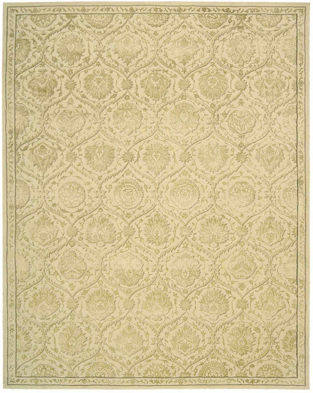 warm paletteA creamy ivory base dominates the palette, with warm beige filling the lattice framework and soft sage green and tan accents bringing the floral motifs to life — the overall effect is quietly sophisticated, like aged parchment with botanical illustrations.