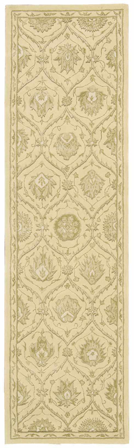 A rectangular runner rug with a soft ivory cream base covering approximately 65% of the surface. An intricate allover Persian floral trellis pattern fills the entire field — a repeating lattice framework of ogee-shaped arches, each enclosing stylized botanical and floral motifs including tulip-like flowers, palmettes, and leaf sprays. The pattern is rendered in warm beige, muted sage green, and soft tan against the ivory ground, creating a tone-on-tone effect with gentle contrast. The border features a coordinating narrow floral vine in the same muted palette. The pile appears medium height with a smooth, even machine-woven surface texture. Edges are cleanly bound with no fringe or tassels. The overall impression is of a refined, antique-inspired Persian design in a soft, neutral colorway.