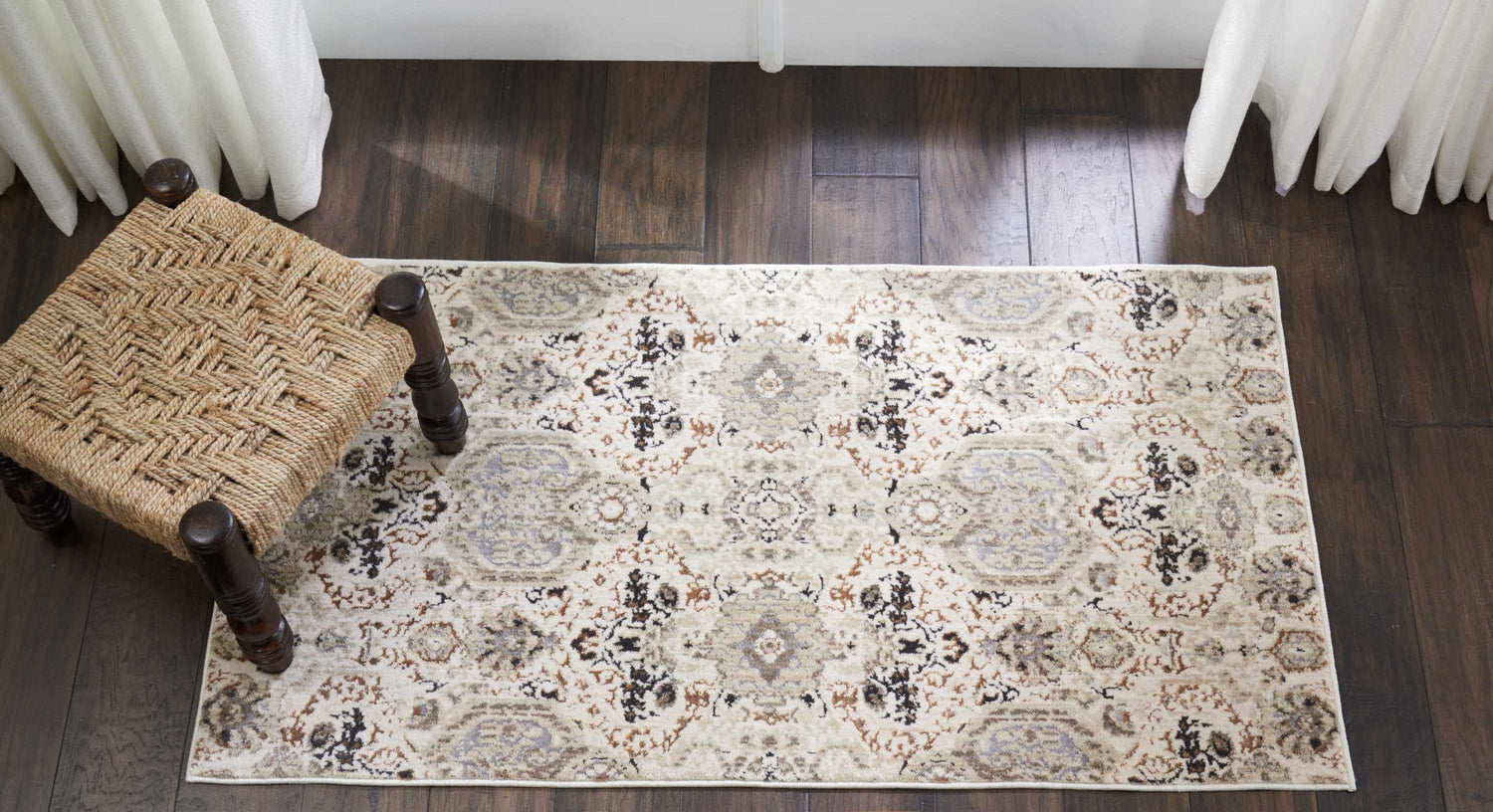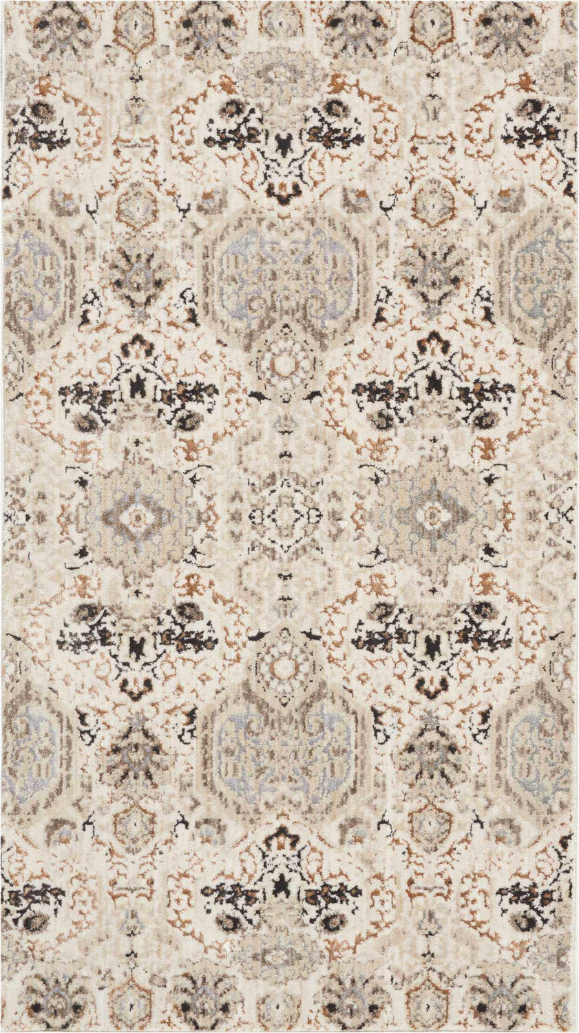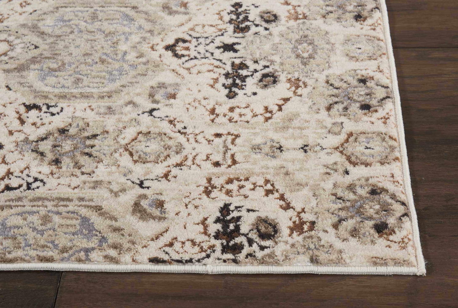 The Nourison Silver Screen area rug brings timeless Persian elegance into any room with its intricate medallion pattern and beautifully faded, distressed finish. A warm cream and ivory base is layered with soft gray, taupe, and brown floral scrollwork, accented by subtle rust and charcoal details that give the design depth and character. The overall palette is earthy and neutral, making it effortlessly versatile — it blends just as naturally into a traditional living room as it does a transitional or contemporary space. At 0.25 inches, the low-to-medium pile sits close to the floor, making it a practical choice for high-traffic areas like hallways, dining rooms, and entryways. The cotton backing adds stability underfoot. Whether you're layering it over a larger natural fiber rug or letting it anchor a seating area on its own, the Silver Screen's classic Persian motifs and muted, sophisticated color story make it a standout piece that feels both collected and refined.