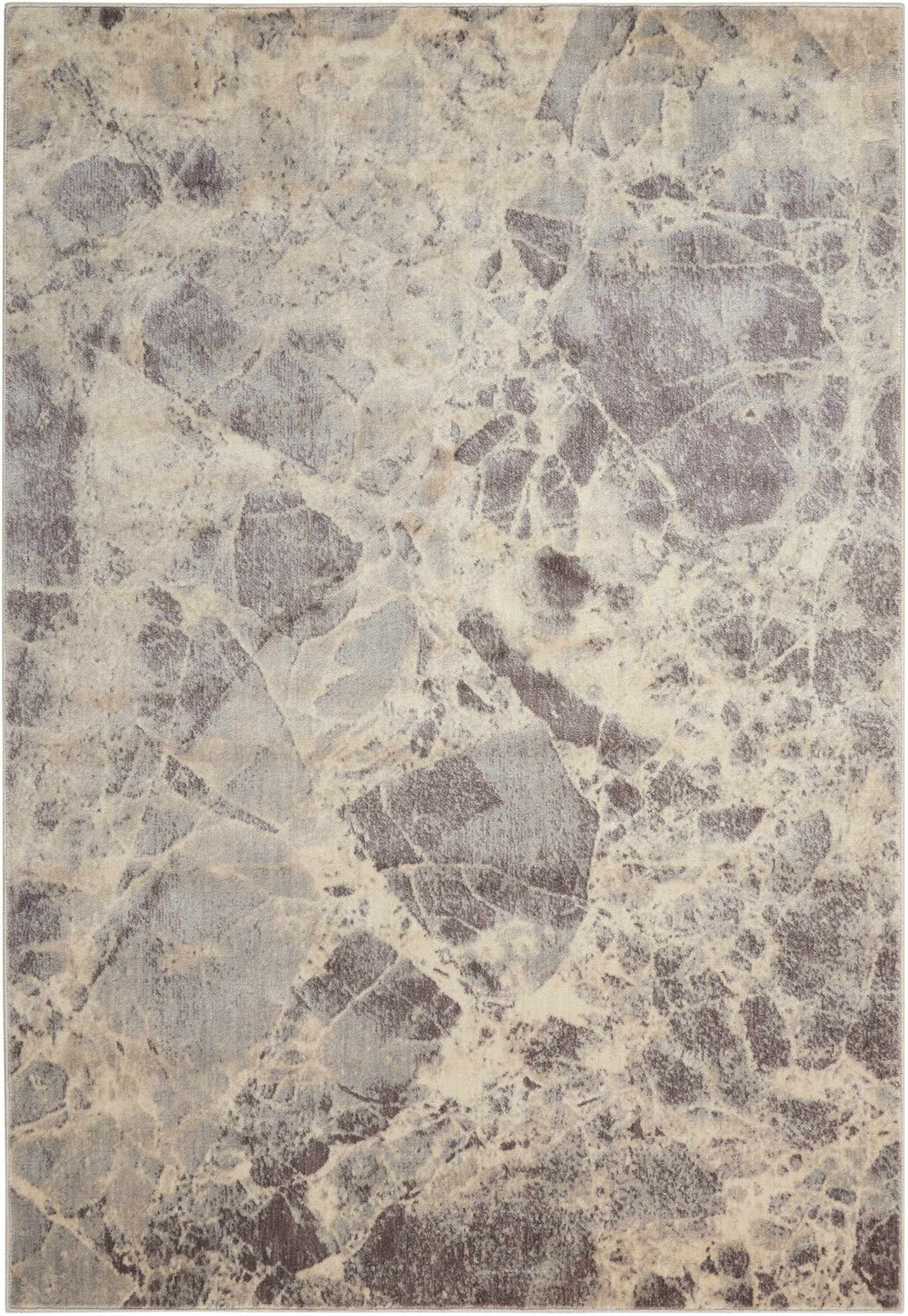 A rectangular area rug with an allover abstract marble-inspired pattern. The surface is dominated by cool medium gray tones with irregular organic shapes — resembling natural stone slabs or broken marble pieces — separated by thin cream and light beige veining lines that wind across the entire field. The gray areas vary in depth from mid-gray to slightly darker charcoal, giving the pattern a layered, dimensional quality. The background between the shapes is a warm cream-beige. The texture appears smooth and low-to-medium pile with a slightly worn, distressed quality to the surface finish. Edges are cleanly bound with no fringe or tassels. The overall impression is of a sophisticated, stone-like surface with a calm, neutral, modern aesthetic.