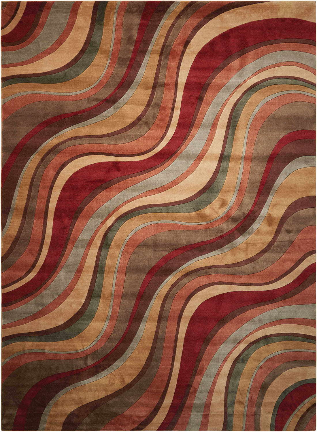 A rectangular area rug featuring a bold, flowing wave pattern composed of parallel undulating bands that sweep diagonally across the entire surface from corner to corner. The bands cycle through deep red/burgundy, warm beige, tan, burnt orange, sage green, muted gray, and brown in a repeating sequence, creating a fluid, almost optical illusion of movement. The pile is medium height with a smooth, machine-woven surface texture and a subtle sheen. Edges are cleanly bound with no fringe or tassels. At a glance, the rug reads as a warm, earthy abstract composition — like a topographic map rendered in autumn colors.