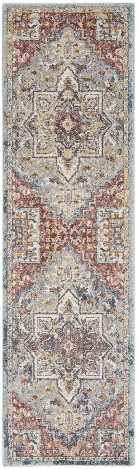 A rectangular runner rug featuring two large, ornate star medallions arranged vertically along the center field, set against a soft slate blue and gray background. Each medallion is rendered in deep rust red, burgundy, cream, and gold with intricate geometric and floral scrollwork detail. The field is surrounded by multiple layered geometric borders in coordinating rust, cream, and blue tones. The overall finish is gently distressed — colors appear slightly faded and softened, giving the rug an antique, heirloom quality. The pile is medium height with a smooth, machine-woven surface texture. Edges are cleanly bound with no fringe or tassels. The rug reads as richly patterned and multicolor at a glance, with warm rust and cool blue as the dominant visual contrast.