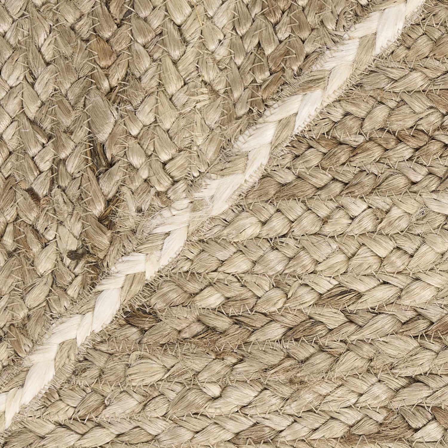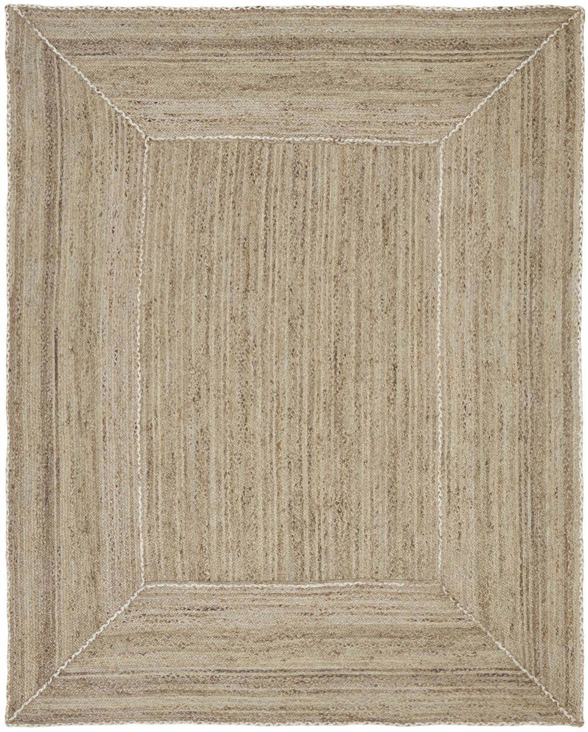 warm paletteA warm, sun-bleached natural beige covers nearly the entire surface, woven through with subtle tan variations in the jute fibers. A crisp white braided border frames the rug cleanly, adding just enough contrast to define the edges without disrupting the calm, earthy palette.