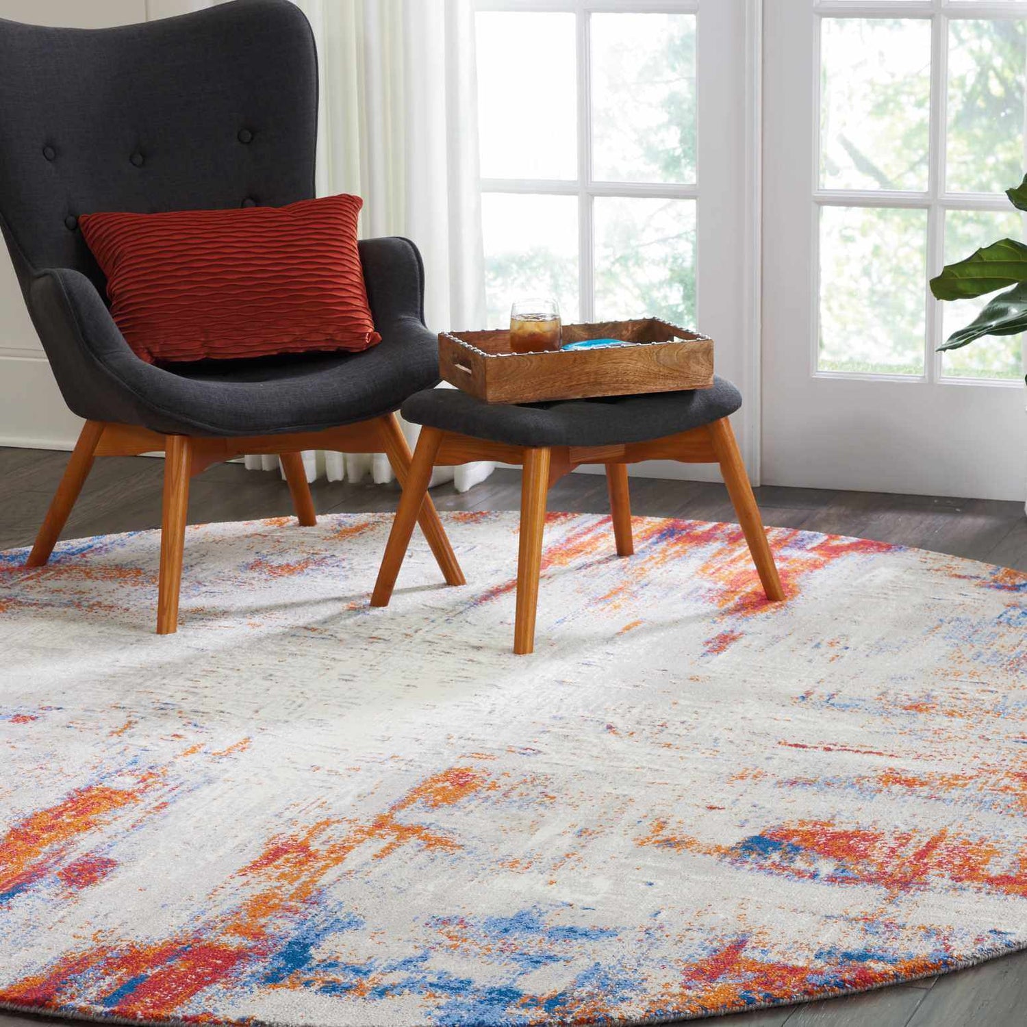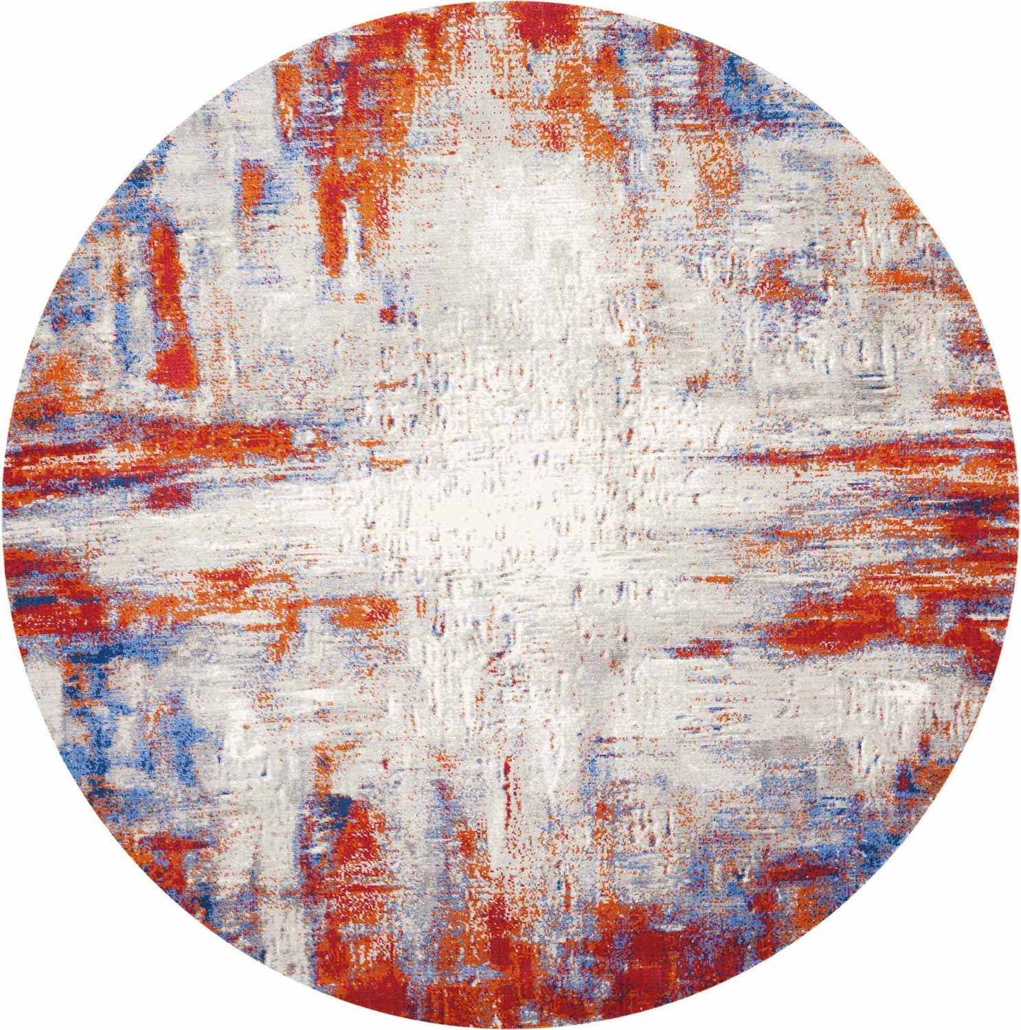 A vivid clash of cobalt blue, fiery red, and soft gray — the Twilight's abstract distressed medallion design looks like modern art for your floor.