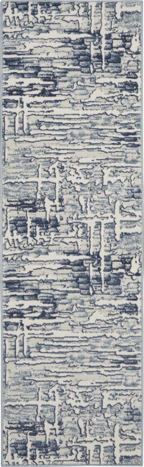 A rectangular runner-format rug with a cream and ivory base overlaid with an allover abstract pattern of deep navy blue and cool gray brushstroke-like marks. The pattern has a distressed, painterly quality — irregular vertical and horizontal strokes create a fragmented, layered texture that resembles weathered plaster or abstract expressionist art. The navy blue is the dominant accent color, appearing in dense clusters across the surface, while gray fills the mid-tones and ivory provides the open, airy background. The pile is medium height with a smooth machine-woven surface texture. Edges are cleanly bound with no fringe or tassels. The overall impression is bold yet refined — a modern abstract design with a cool, sophisticated color palette.