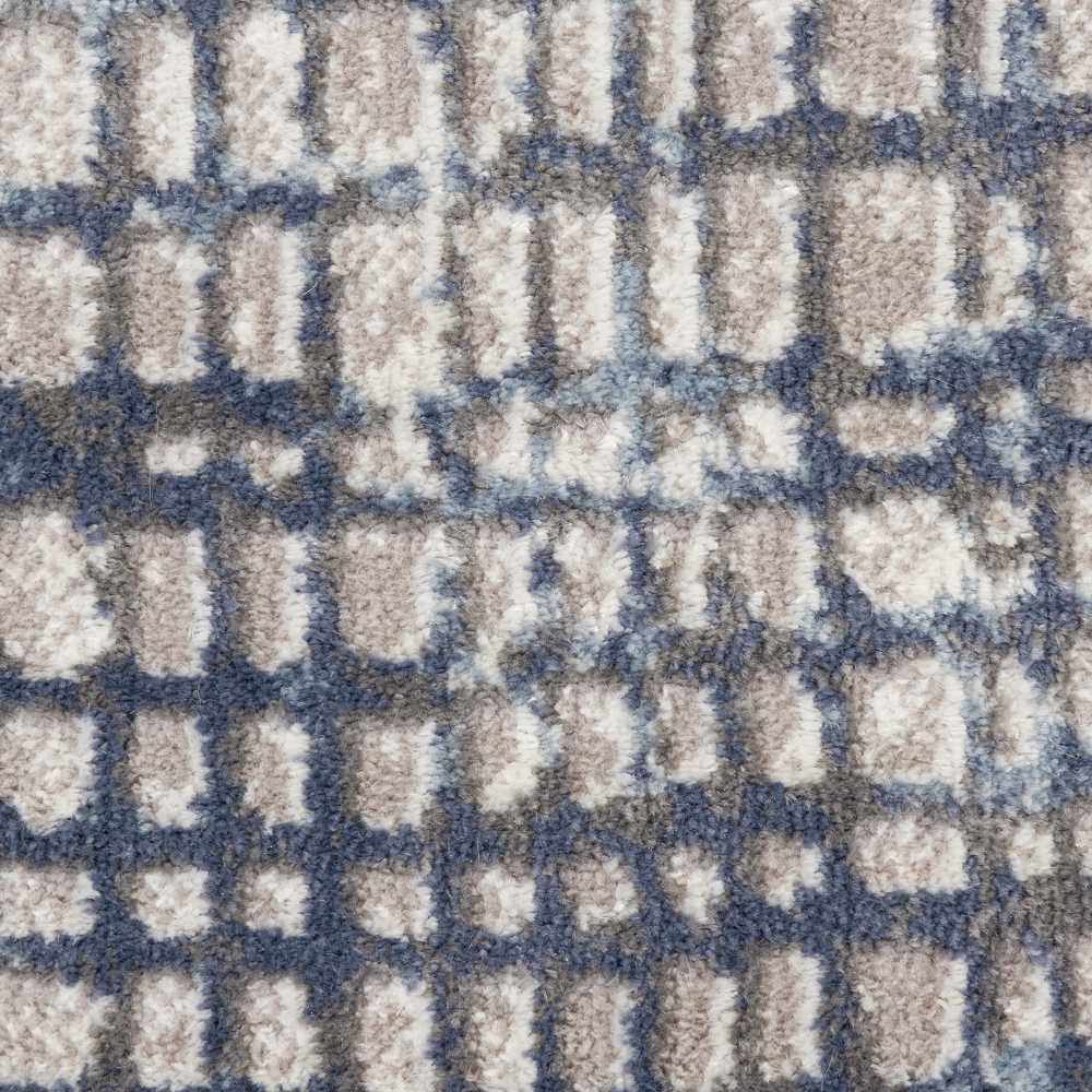 - Allover abstract crosshatch pattern in slate blue, gray, and ivory