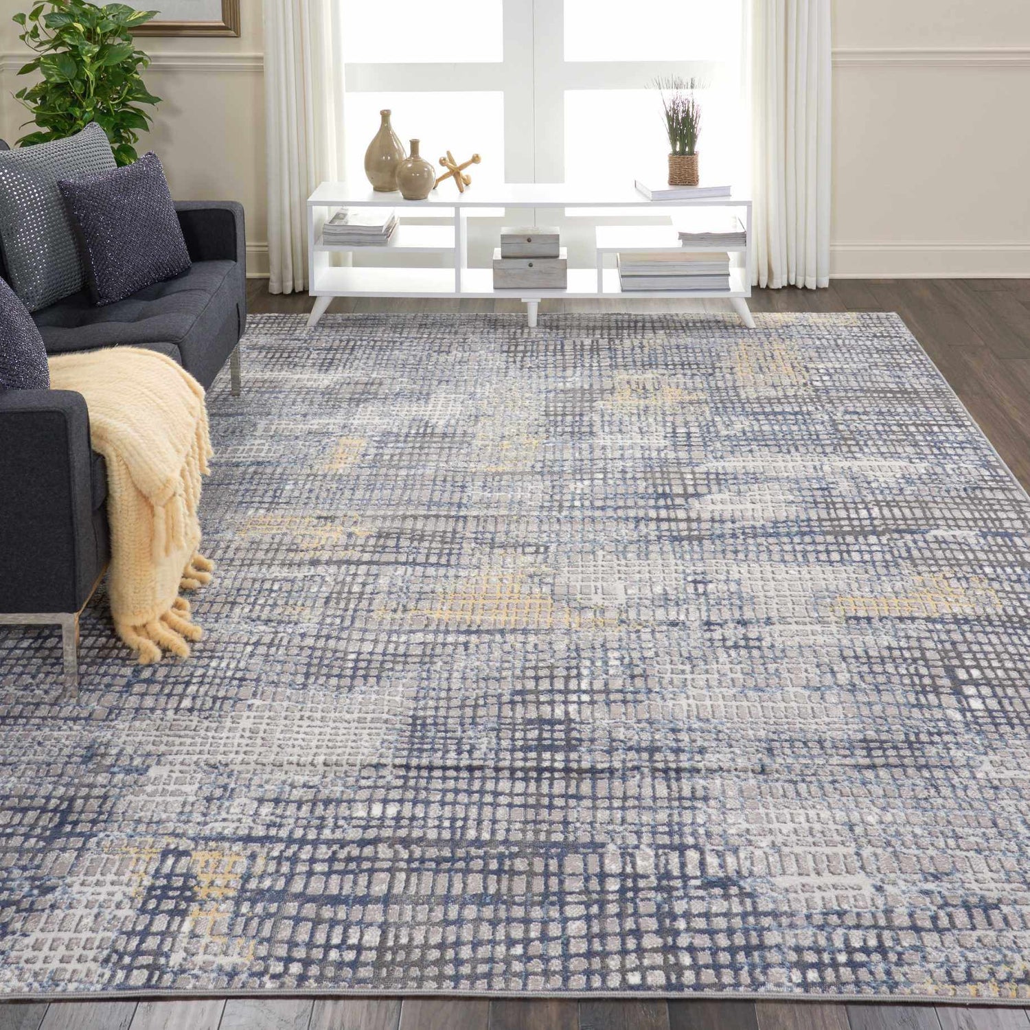 A rectangular medium-pile area rug with an allover abstract crosshatch pattern. The base is a layered mix of slate blue and soft gray, with an ivory/cream ground visible through the irregular grid-like marks. Warm golden-yellow accents appear scattered throughout, concentrated in clusters that break up the cool tones. The overall effect is distressed and faded — as if the pattern has been gently worn over time — giving it a watercolor or painterly quality. The surface texture is smooth and uniform with a low-to-medium pile height of approximately 0.5 inches. Edges are cleanly bound with no fringe or tassels. The rug has a cool-dominant palette with warm accent notes and a soft, hazy visual impression at a glance.
