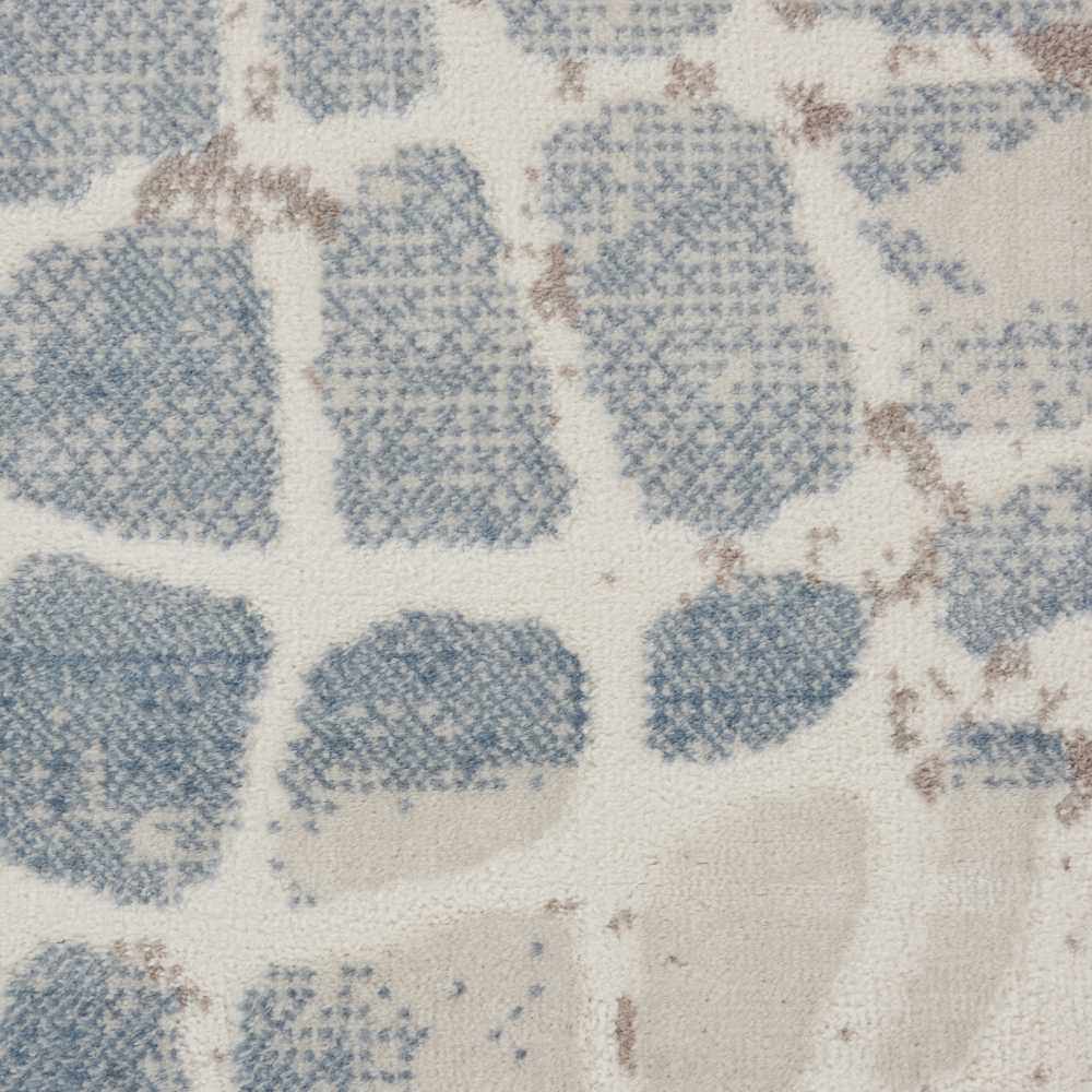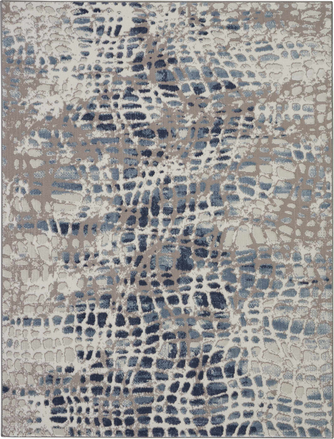 A rectangular medium-pile area rug with an allover abstract pattern resembling cracked earth or exotic reptile skin scales. The base color is a warm ivory/cream, overlaid with an organic network of irregular cell-like shapes outlined in cool gray, slate blue, and deep navy. The navy appears most concentrated in diagonal bands across the rug, while lighter blue-gray tones fill the mid-ground. The overall effect is layered and slightly faded, like a watercolor wash. The surface has a smooth, machine-woven texture with a low-to-medium pile. Edges are cleanly bound with no fringe or tassels. The pattern is allover with no border or central medallion.