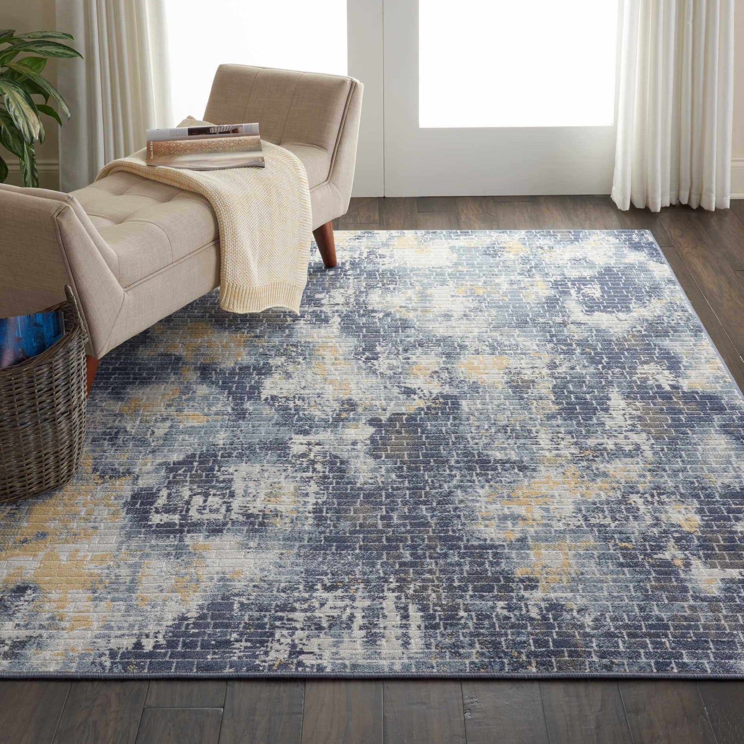 A rectangular area rug with an allover abstract mosaic pattern built from a fine grid of small rectangular tile-like marks. The dominant color is deep navy and slate blue, covering roughly half the surface. Across this base, large organic cloud-like shapes in faded ivory, warm golden yellow, and soft gray drift across the rug as if painted in loose watercolor strokes, creating a distressed, layered effect. The transition between colors is soft and blended, not sharp — giving the impression of a weathered fresco or aged mosaic wall. The pile is low and smooth with a machine-woven surface texture. Edges are cleanly bound with no fringe or tassels. The overall impression is of a sophisticated, gallery-quality abstract with a cool blue palette warmed by gold accents.