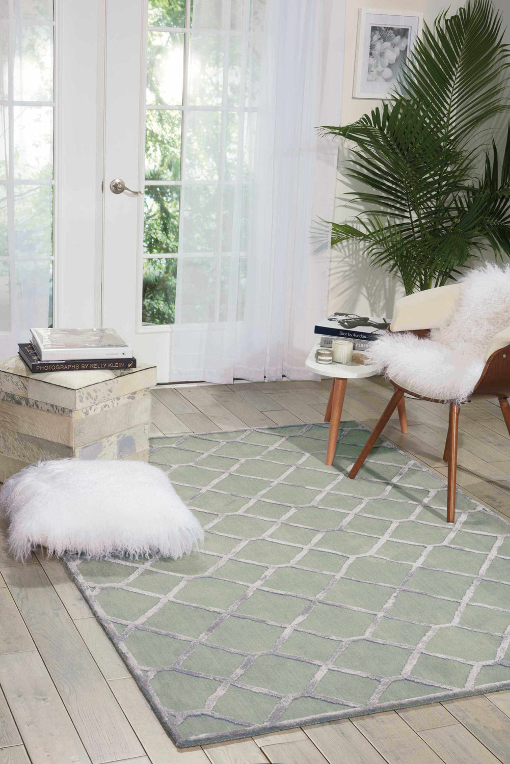 A soft sage green field with a repeating diamond trellis in warm beige — the Vita brings quiet, contemporary elegance to any room without trying too hard.