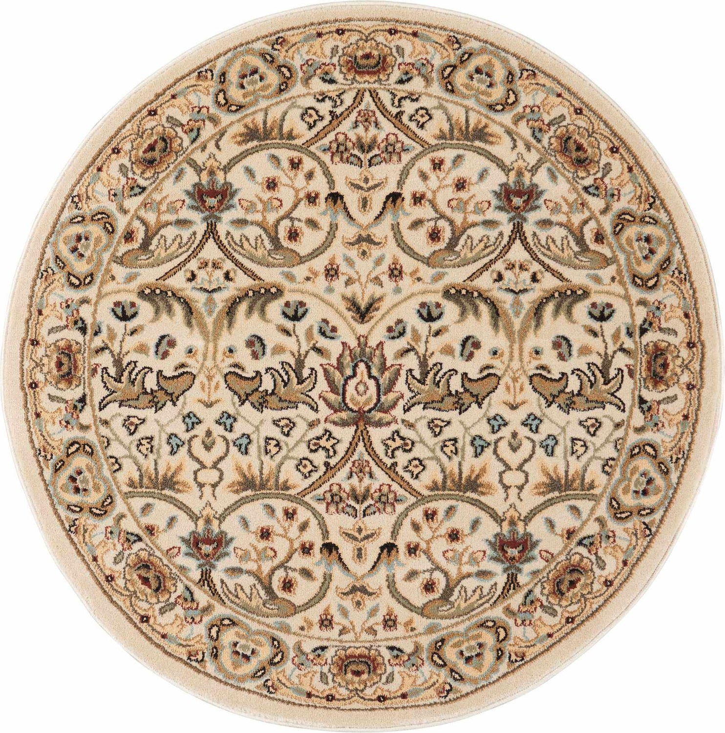 A round area rug with a luminous ivory and warm cream base completely covered in an allover traditional Persian-style floral and scrollwork pattern. The design features flowing botanical vines, stylized flowers, and leaf motifs rendered in muted tones of sage green, warm tan, soft brown, dusty gold, and faint light blue — all on the ivory ground. A clearly defined ornate border frames the circular field with complementary floral and scroll detailing. The pile is medium height with a smooth, machine-woven surface texture. Edges are cleanly bound with no fringe or tassels. The overall impression is of a classic, heirloom-quality Persian medallion rug in a soft, neutral colorway.