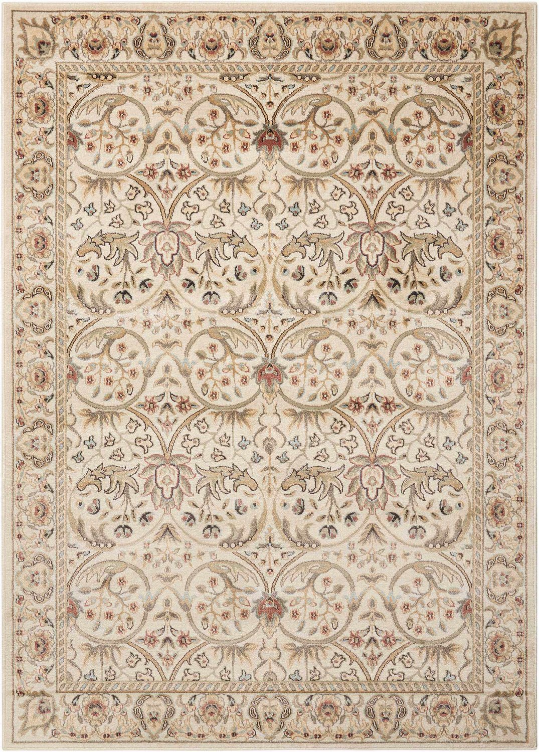 The Nourison Walden area rug brings timeless elegance to any room with its classic Persian-inspired floral design rendered in a soft, luminous ivory and cream palette. The allover scrolling botanical motifs, delicate leaf details, and ornate border are woven in muted tones of sage green, warm tan, soft brown, and whispers of light blue — creating a refined, layered look that feels both traditional and effortlessly livable. Available in a round format, this rug is a natural centerpiece for a formal dining room, a cozy sitting area, or a bedroom where you want to anchor the space with understated sophistication. The medium pile at 0.5 inches offers comfortable underfoot cushioning without being overly plush, and the jute backing keeps it grounded on hardwood or tile floors. Its neutral ivory base makes it incredibly versatile — it pairs beautifully with warm wood tones, soft linens, and classic upholstered furniture. Whether your home leans traditional, transitional, or quietly elegant, the Walden delivers a polished, heirloom-quality look at an accessible price point.