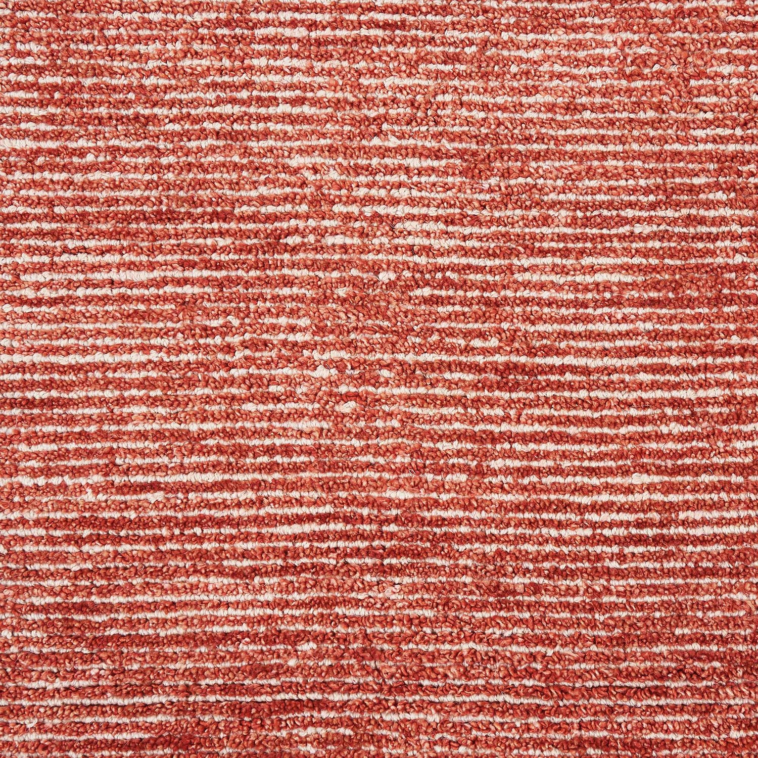 A rectangular runner-proportioned area rug with a warm brick-red and rust dominant palette, woven in a dense horizontal stripe pattern that creates subtle tonal variation across the surface. The color shifts organically from deep brick red and rust to softer terracotta and cream highlights, giving the surface an ombre-like, hand-crafted appearance. The pile is medium height with a slightly textured, woven surface that catches light and shows depth. Edges are cleanly bound with no fringe or tassels. The overall impression is of a warm, earthy, artisanal-modern rug with rich color and quiet pattern interest.
