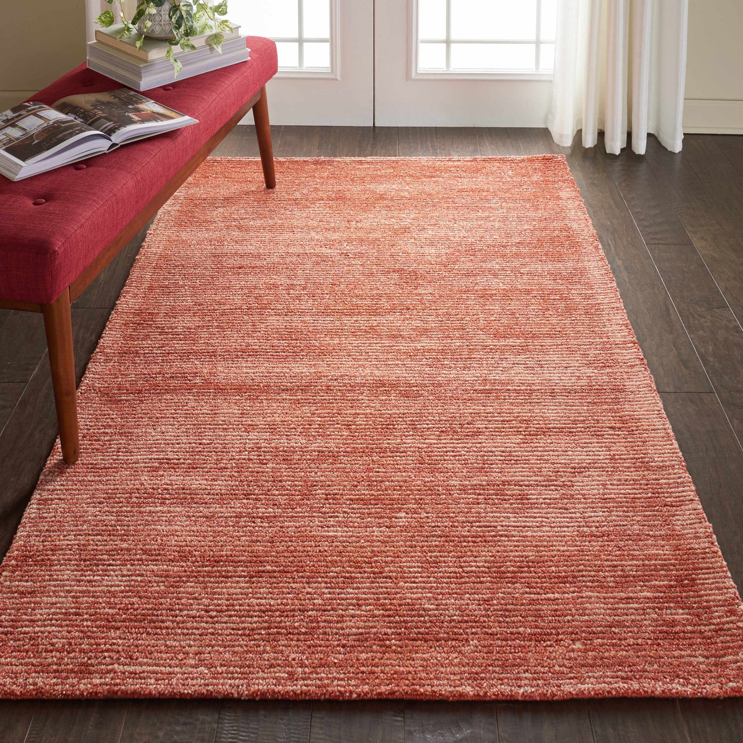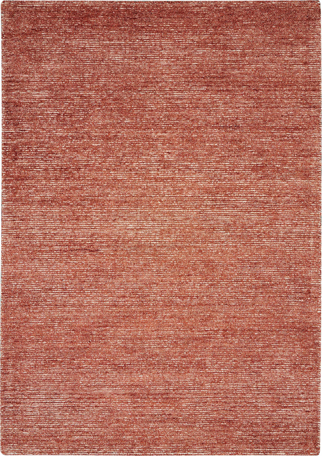 Warm brick-red tones and an organic, textured weave make the Nourison Weston a standout anchor for modern and transitional spaces craving earthy color.