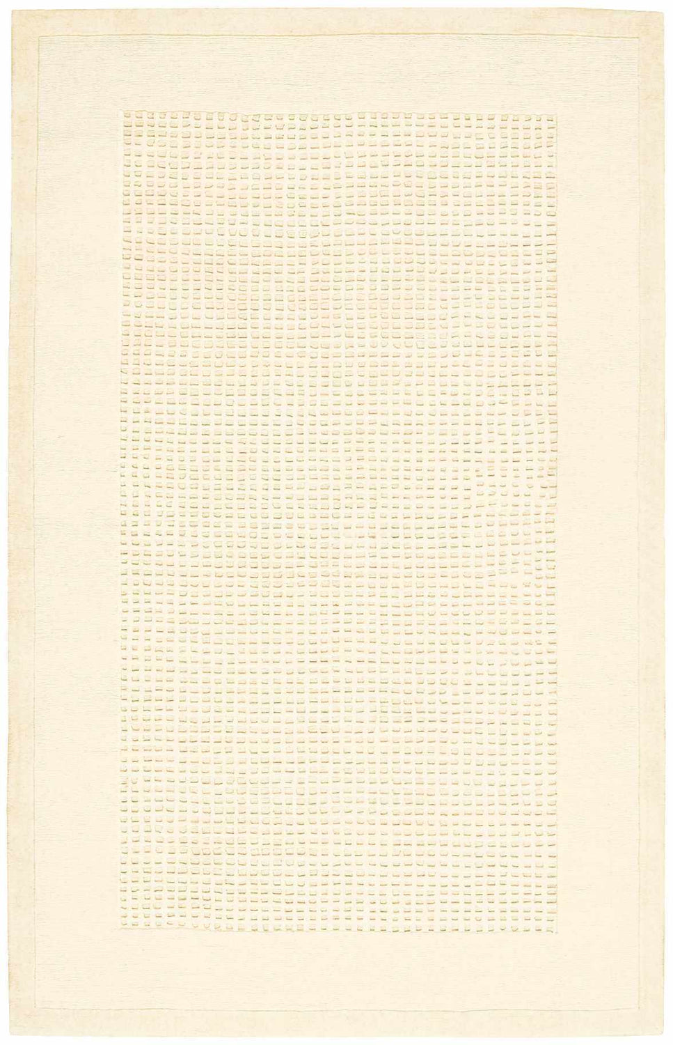 A rectangular area rug in a warm ivory colorway with a tone-on-tone design. The central field is filled with a subtle, allover woven texture — small, tightly packed raised marks or loops that create a grid-like tactile pattern visible up close but reading as a soft, unified ivory surface from a distance. A clean, flat border in a slightly deeper cream or ivory frames the entire rug, creating a quiet but defined edge. The pile is medium height with a smooth, even surface. No fringe, no tassels — edges are cleanly bound. The overall impression is one of quiet luxury: a luminous, almost monochromatic ivory rug with just enough texture to feel intentional and refined.
