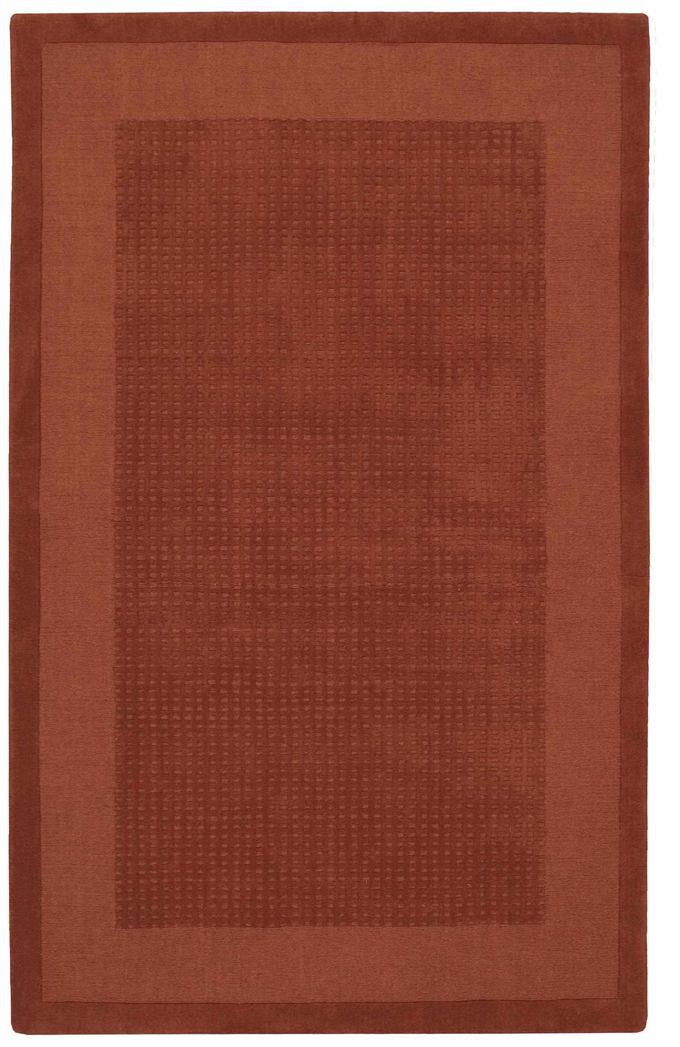 A rectangular area rug in rich rust and terracotta tones with a tone-on-tone design. The wide, flat border in a slightly deeper terracotta frames the entire perimeter, while the interior field features a subtle allover dot or small grid texture in a slightly lighter rust shade — visible primarily when light catches the pile. The overall effect is nearly solid from a distance, with the pattern emerging only on closer inspection. The pile appears medium height with a smooth, even surface and no fringe or tassels. Bound edges finish the rug cleanly. The overall impression is warm, modern, and quietly textured.