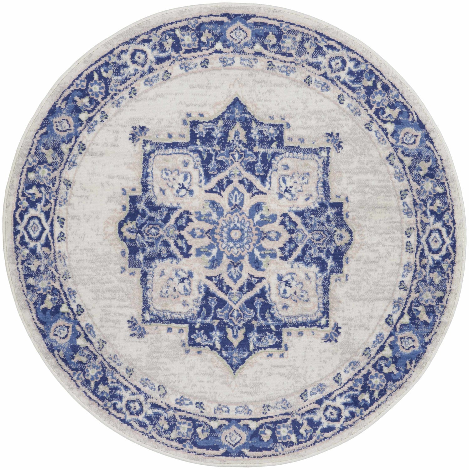 cool paletteA rich cobalt and navy blue dominates the ornate border and medallion details, while a soft ivory field opens up the center — lighter blue accents and faint gray tones give the whole palette a gently faded, antique quality.