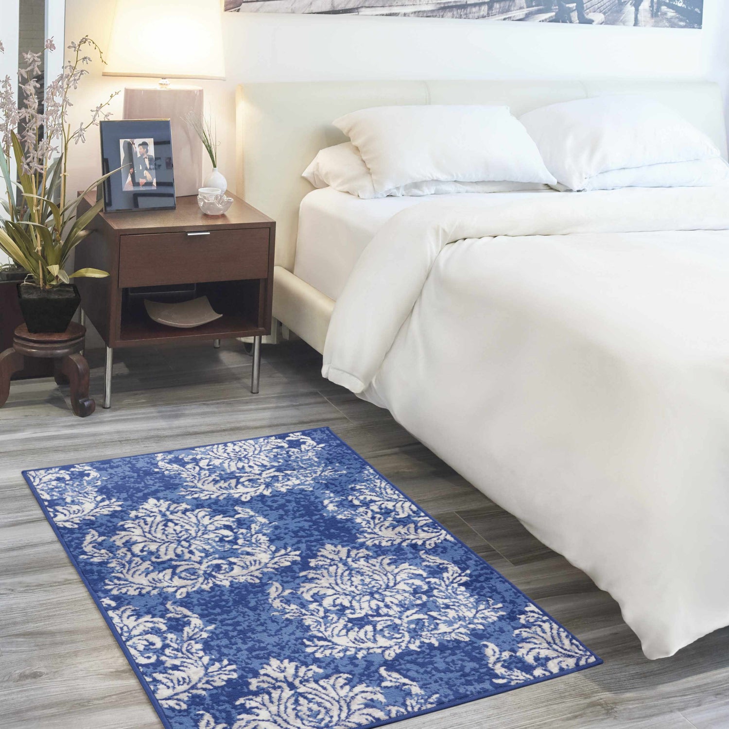 A bold navy blue damask with beautifully faded ivory scrollwork — the Nourison Whimsicle brings timeless traditional elegance with a lived-in, distressed finish.