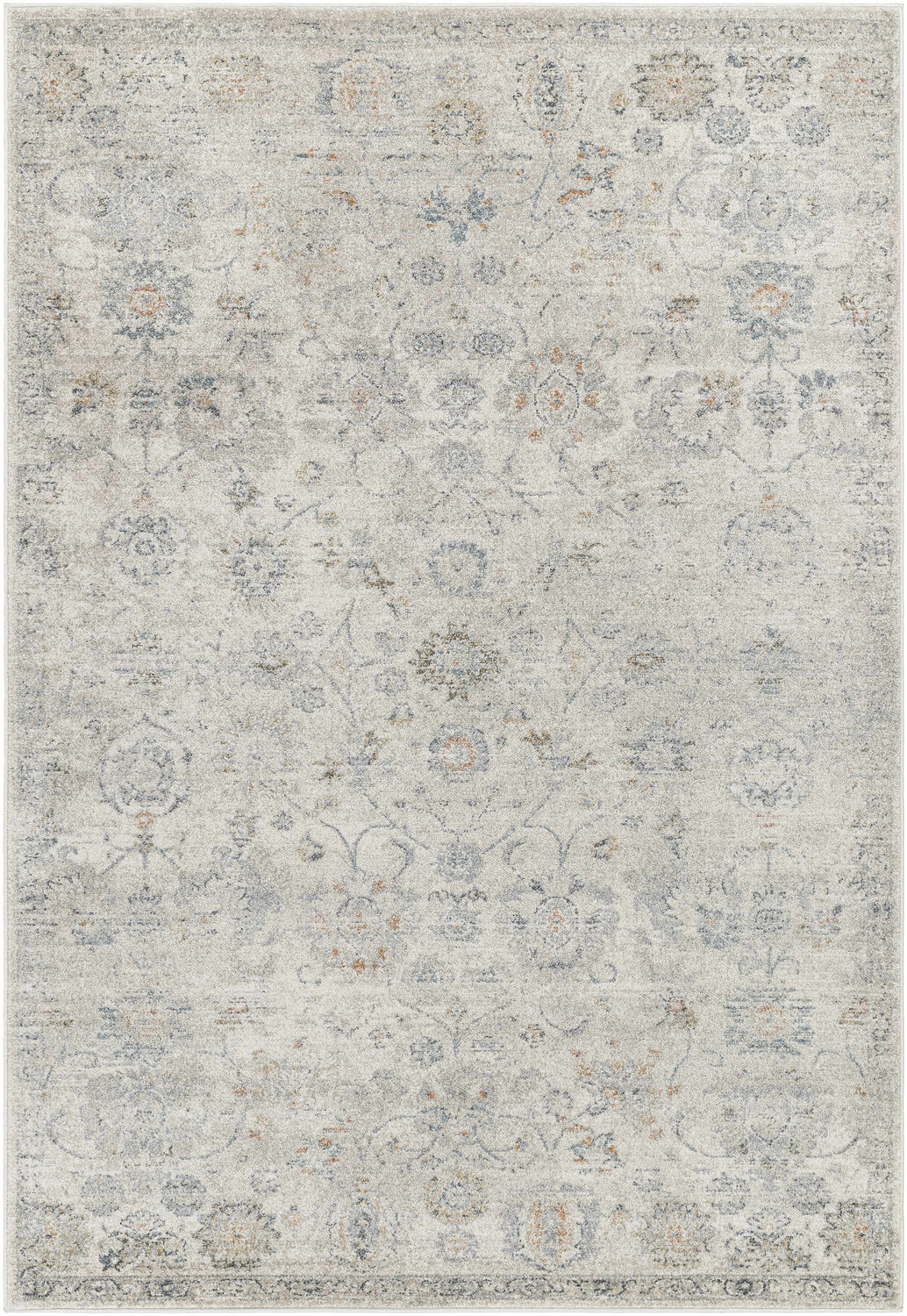 A rectangular area rug with an allover traditional Persian floral pattern rendered in a softly faded, vintage-washed palette. The field is a warm beige-cream base densely filled with scrolling botanical motifs — stylized flowers, curved stems, and leaf forms — in muted gray, dusty blue, warm brown, and soft tan. The pattern repeats uniformly across the entire surface with no central medallion, giving it an all-over textile feel. A subtle tonal border frames the edges in a slightly deeper gray-beige. The surface has a smooth, low-to-medium machine-woven texture with a slightly worn, antiqued appearance as if the colors have been gently bleached by sunlight. Edges are cleanly bound with no fringe or tassels. The overall impression is of a quiet, elegant antique-style rug in a completely neutral, versatile colorway.