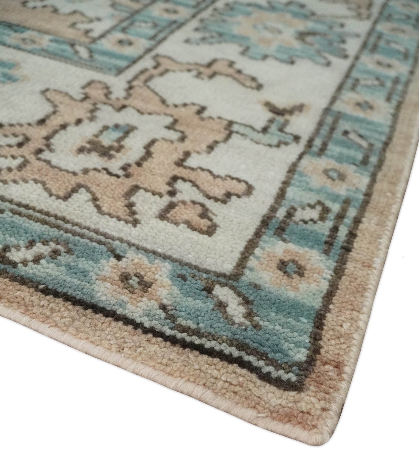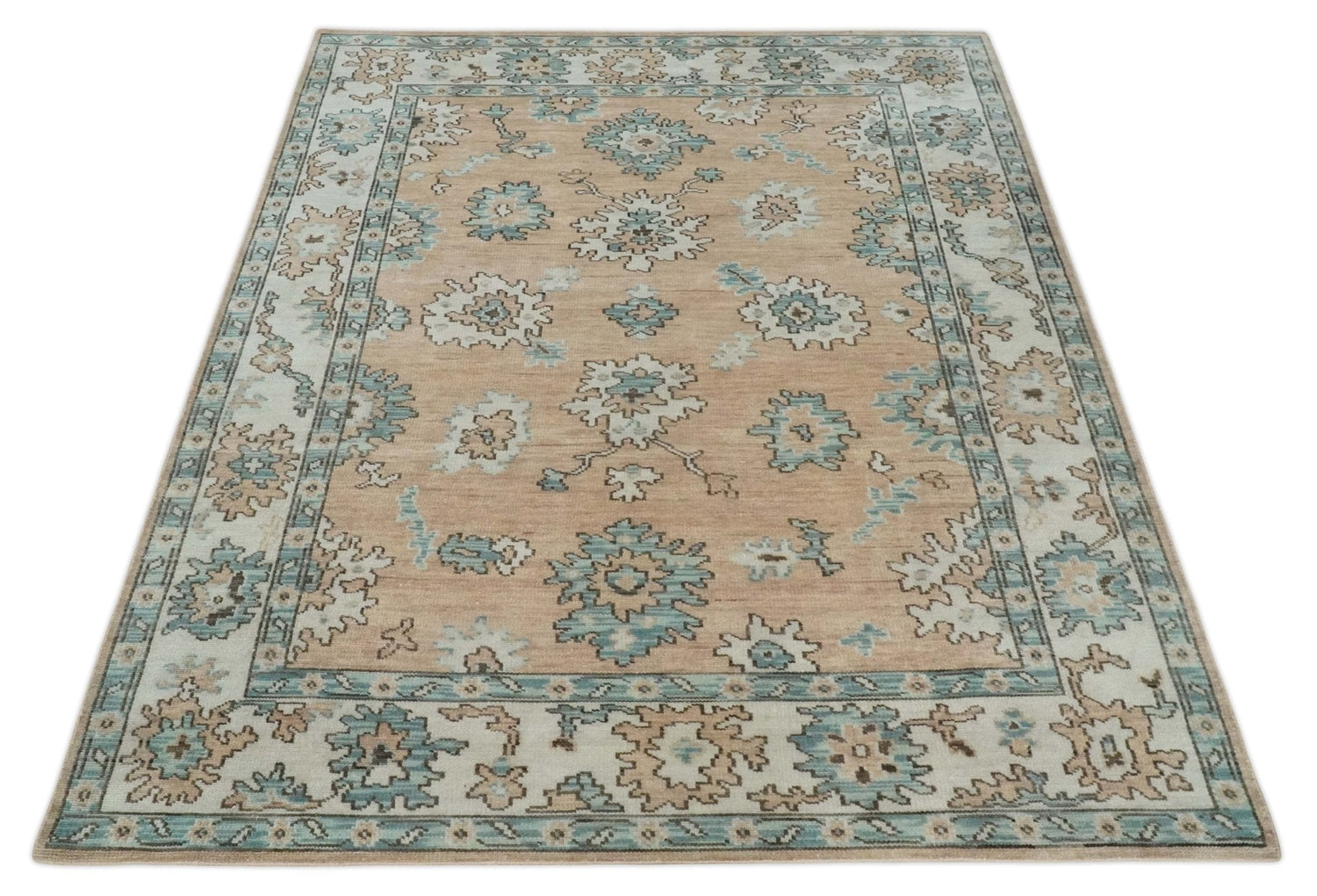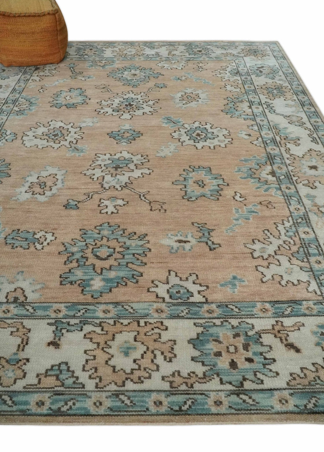 Peach, Ivory and Teal Hand knotted Traditional Oushak Multi Size wool Area Rug