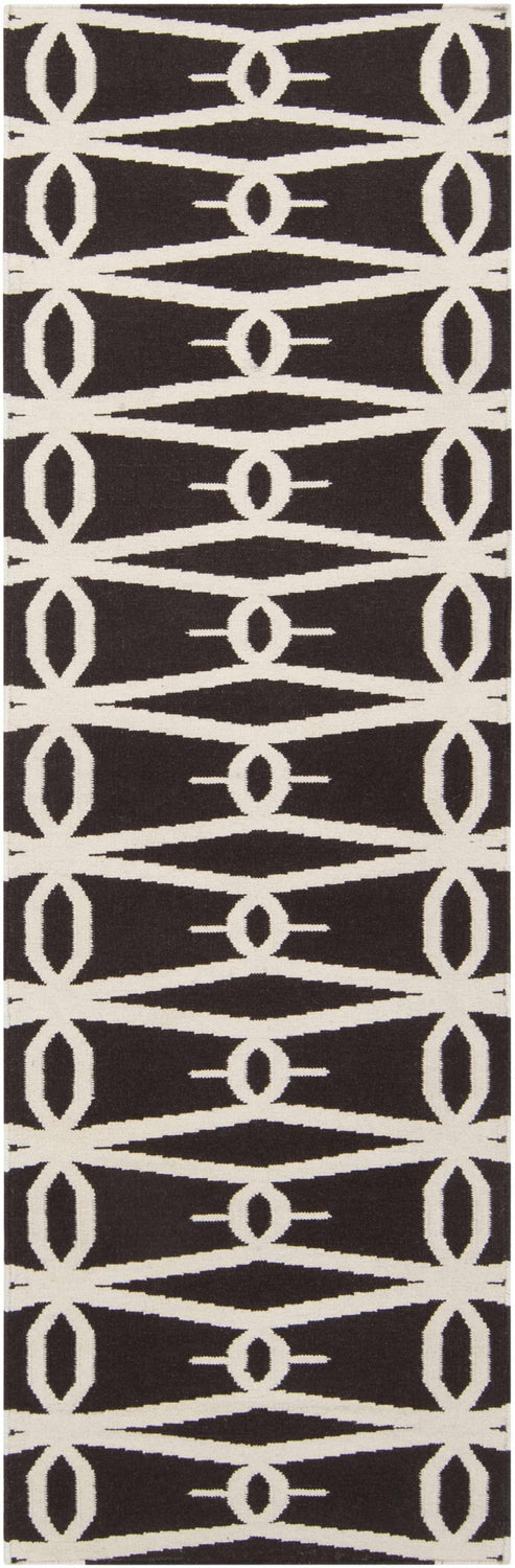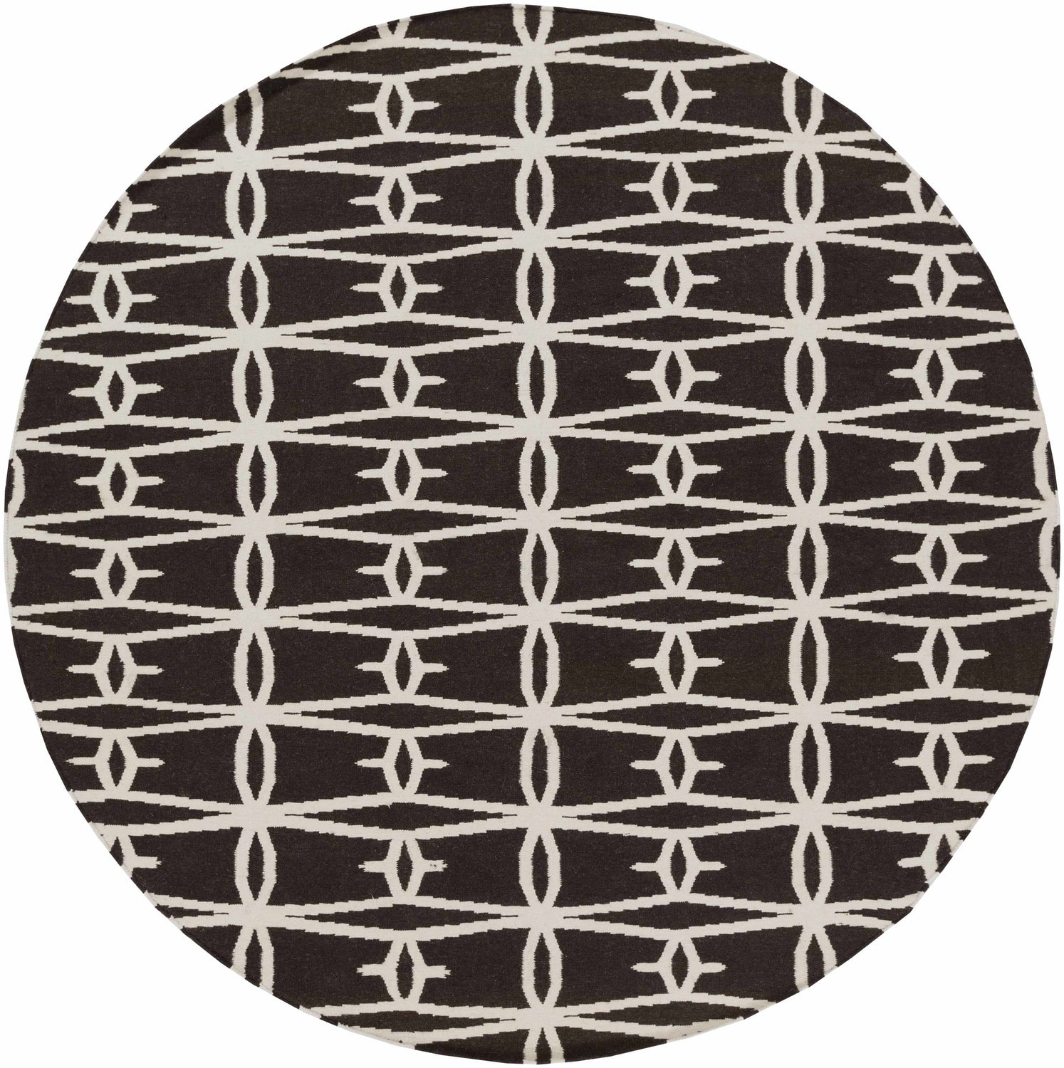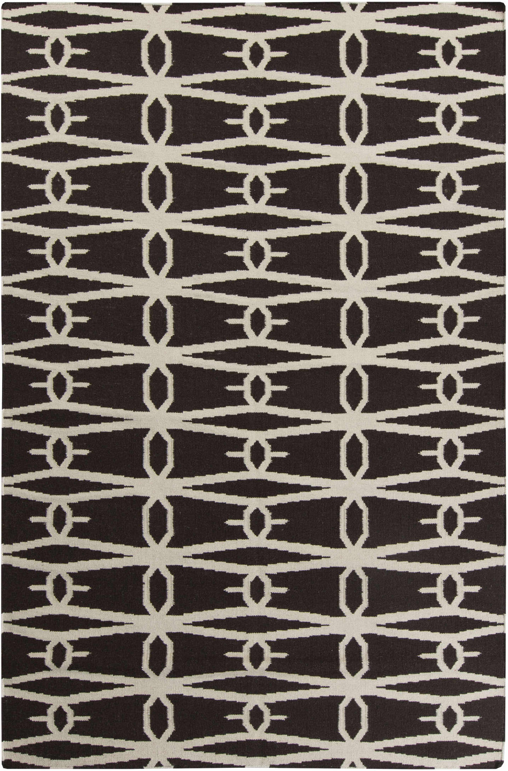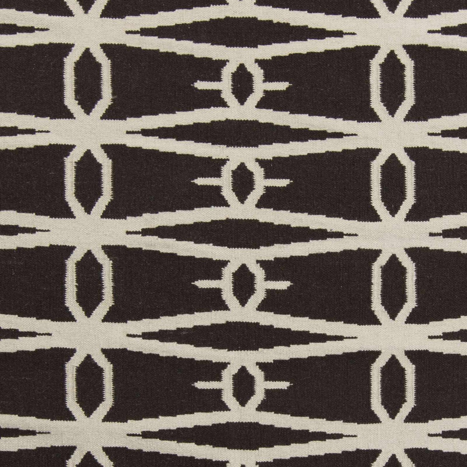 A rectangular flatweave area rug with a deep near-black background and a bold cream-colored repeating geometric pattern. The pattern consists of interlocking elongated diamond shapes connected by small oval links, forming a continuous lattice trellis across the entire surface. The cream lines are clean and precise against the dark ground, creating a high-contrast graphic effect. The weave is tight and flat with a smooth, low-texture surface typical of hand-woven flatweave construction. Edges are cleanly bound with no fringe or tassels. The overall impression is bold, modern, and graphic — like a graphic design print rendered in wool.