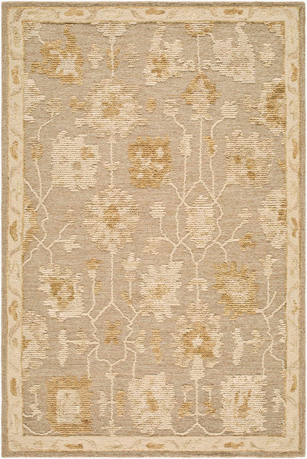 Warm taupe and cream tones meet handmade artistry in the Pubyli — an ikat-inspired traditional rug with a satisfying medium pile and timeless appeal.