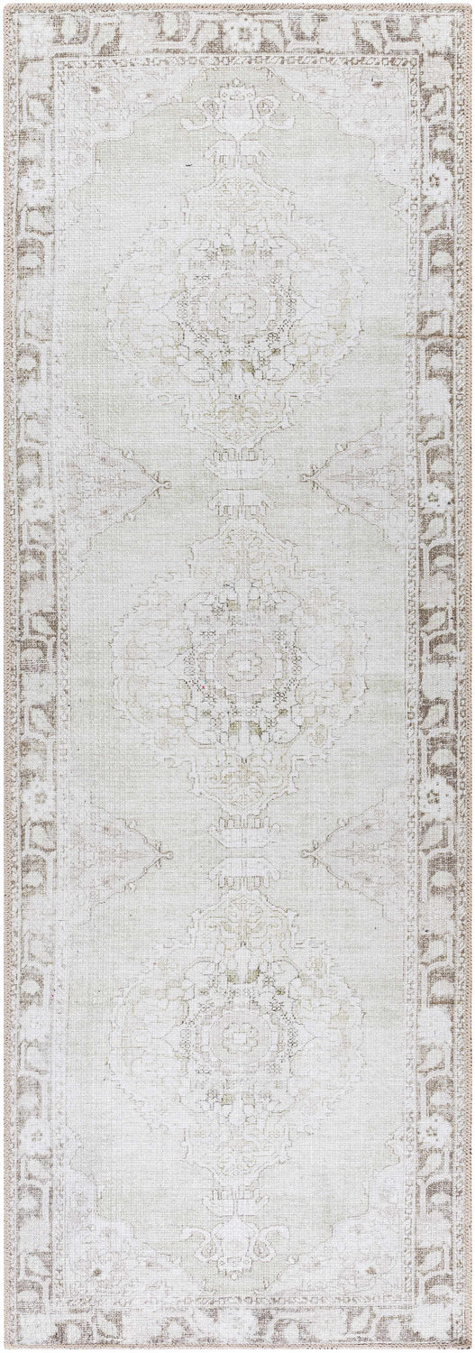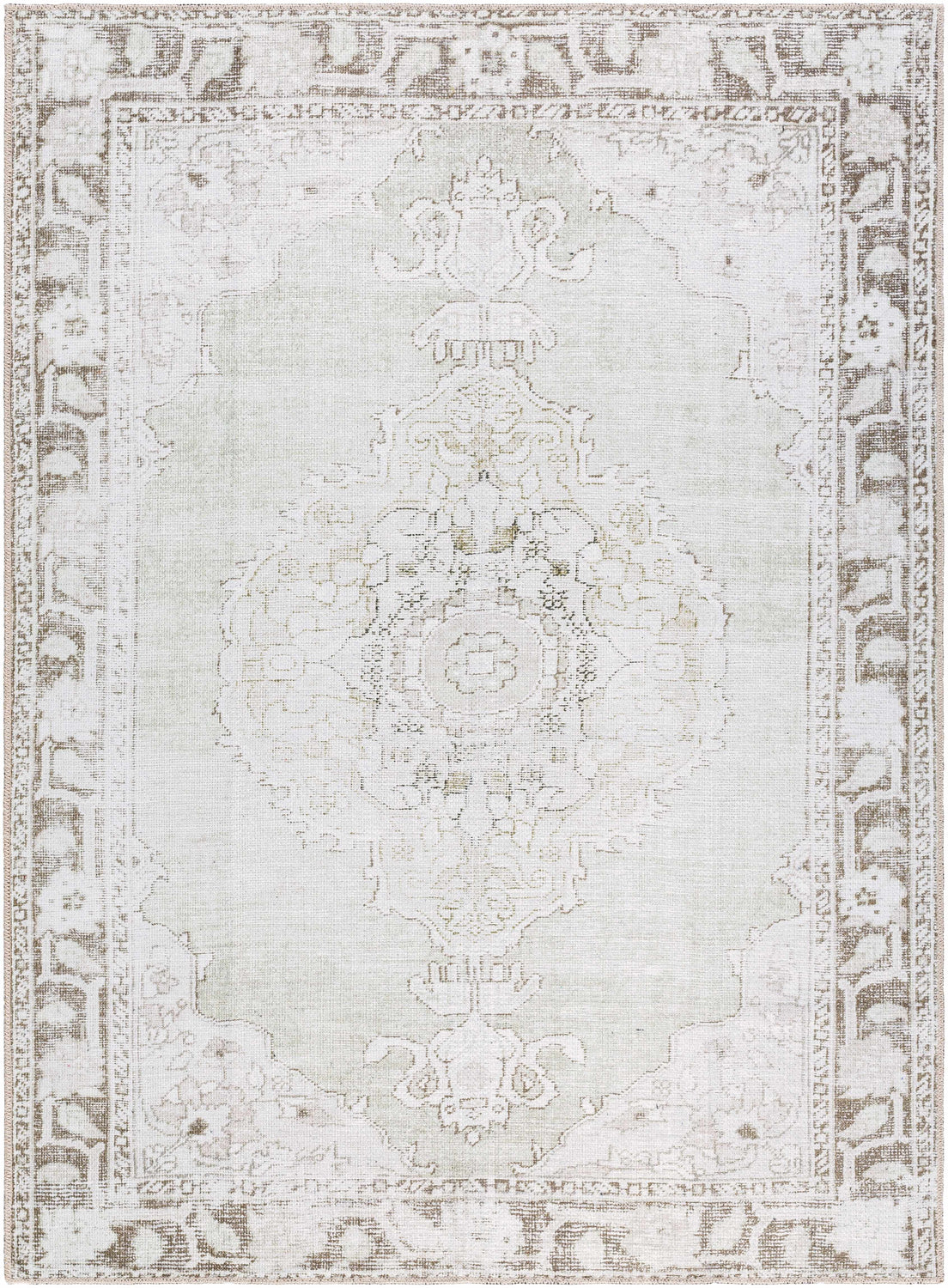 Experience the timeless elegance of the Livabliss x Our PNW Home Rainier Medallion Gray Washable Area Rug, a special collaboration between PNW Home x Livabliss that beautifully blends updated traditional styling with modern durability. The rug showcases a classical medallion design with a faded antique look, perfect for adding a touch of vintage charm to any space. It's machine woven from durable polyester, making it ideal for high-traffic areas in your home. Its light and faded shades of pewter and green are bordered by an assortment of brown earth tones, creating a versatile palette that can complement a wide range of decor styles. This Turkish-made rug is also easy to care for - simply machine wash on cold delicate cycle and line dry. For optimal use, we recommend pairing this rug with a compatible rug pad. Elevate your living space with the Livabliss x Our PNW Home Rainier Medallion Gray Washable Area Rug today!
