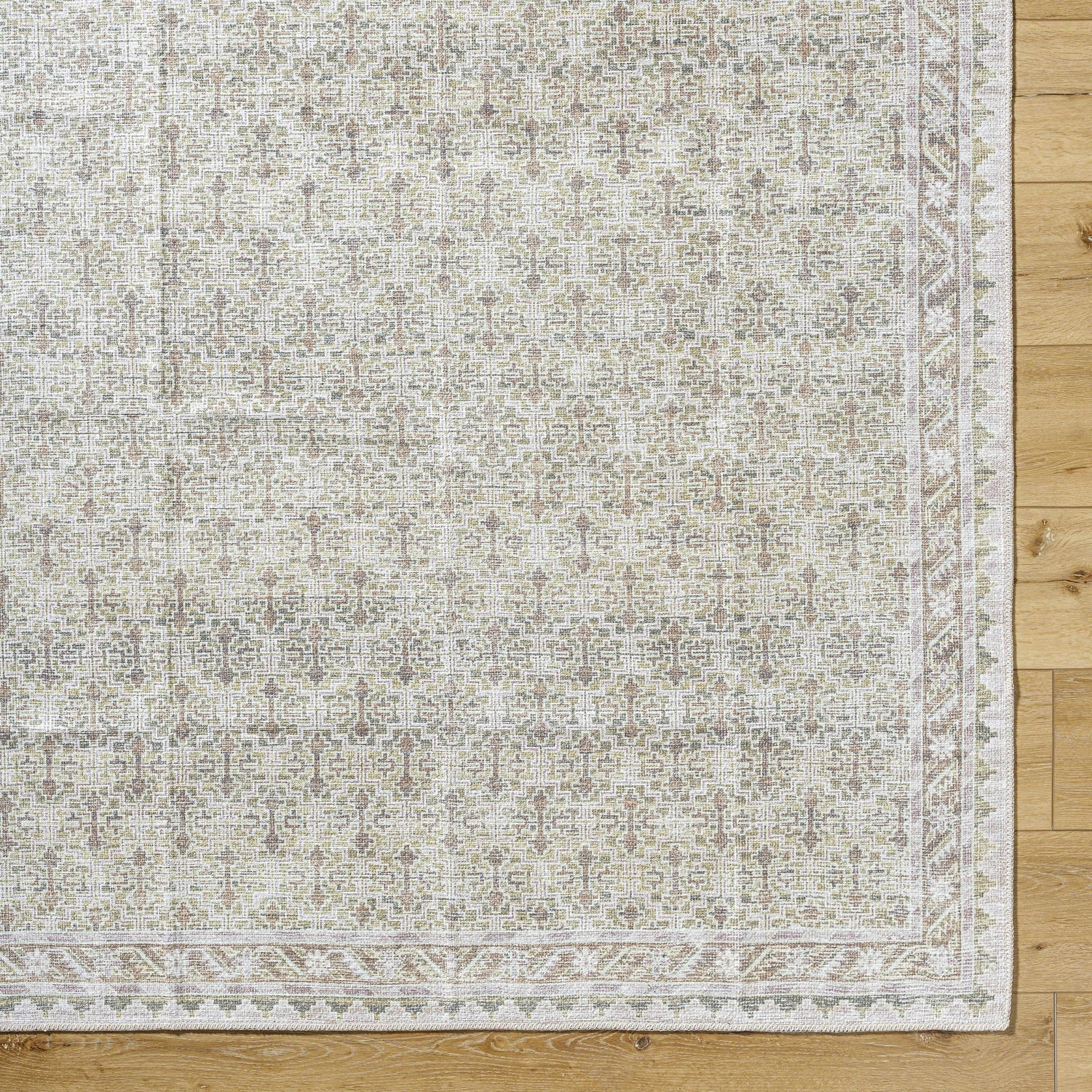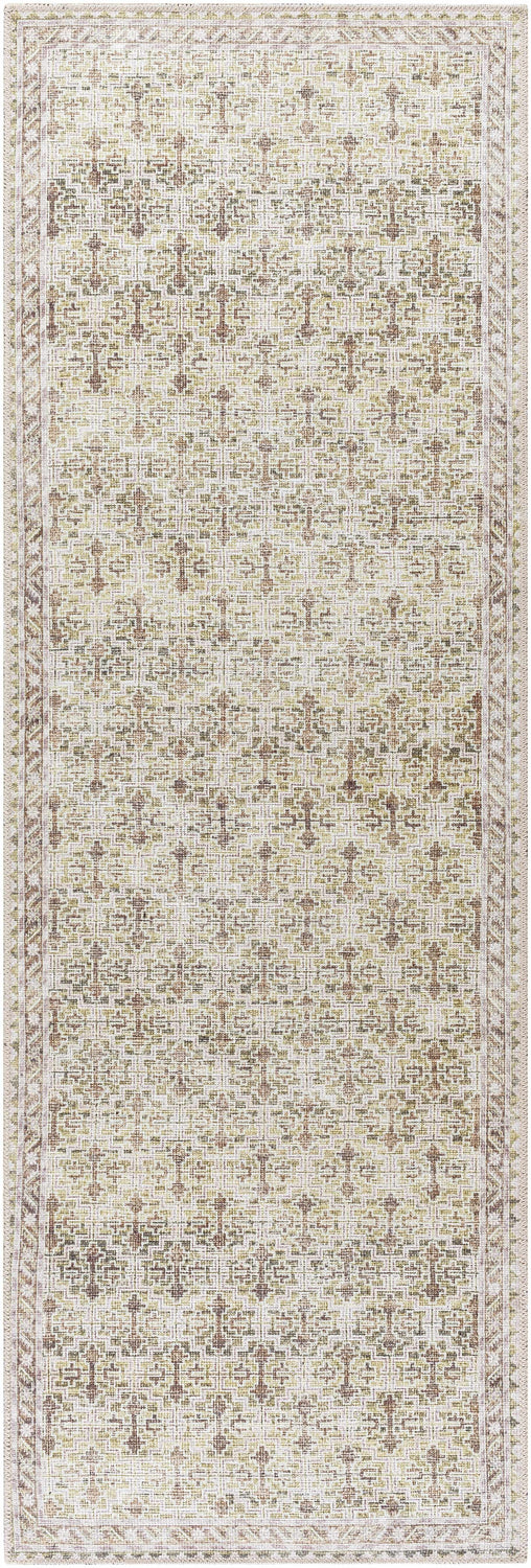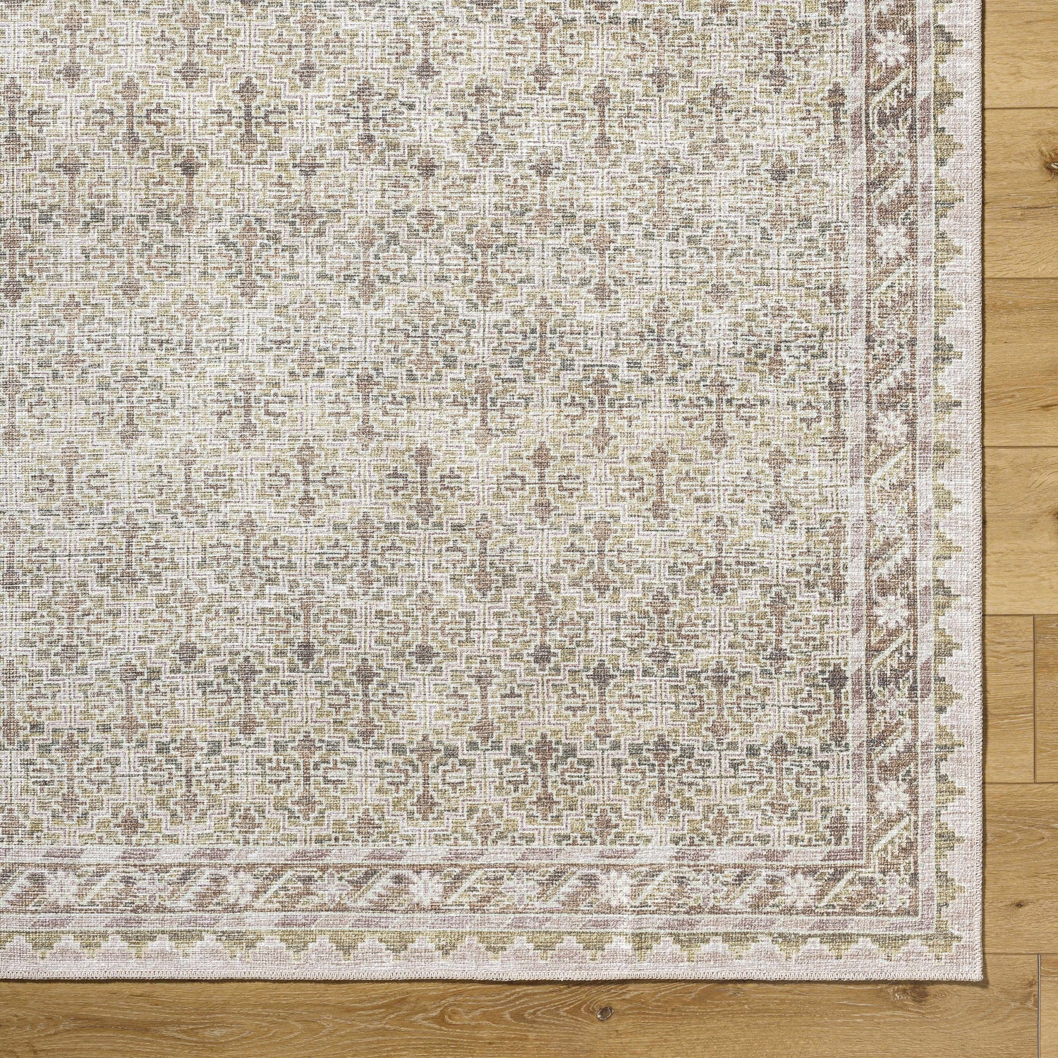 Welcome to the Livabliss x Our PNW Home Rainier Damask Tan Washable Rug Collection, a unique collaboration between PNW Home x Livabliss that brings an updated traditional style into your living space. This stunning area rug captivates with its vintage geometric pattern and earthy colors of green and brown, elegantly edged in off-white and pearl. Born in Turkey through machine-woven construction, it is composed of durable polyester, promising longevity even in high-traffic areas. For your convenience, this no-pile rug is effortlessly maintained - just pop it into the washing machine on a cold delicate cycle with non-chlorine bleach only and line dry. To enhance its lifespan and comfort underfoot, we recommend using it with a rug pad.