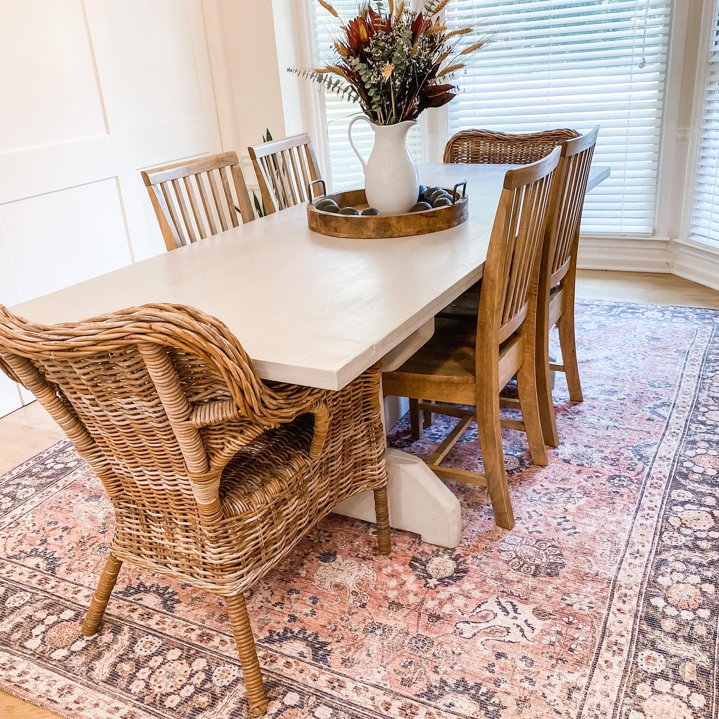 When selecting a dining room rug, choose one large enough to fit under the table and chairs, ensuring that when the chairs are pulled out, they remain on the rug for a balanced look.