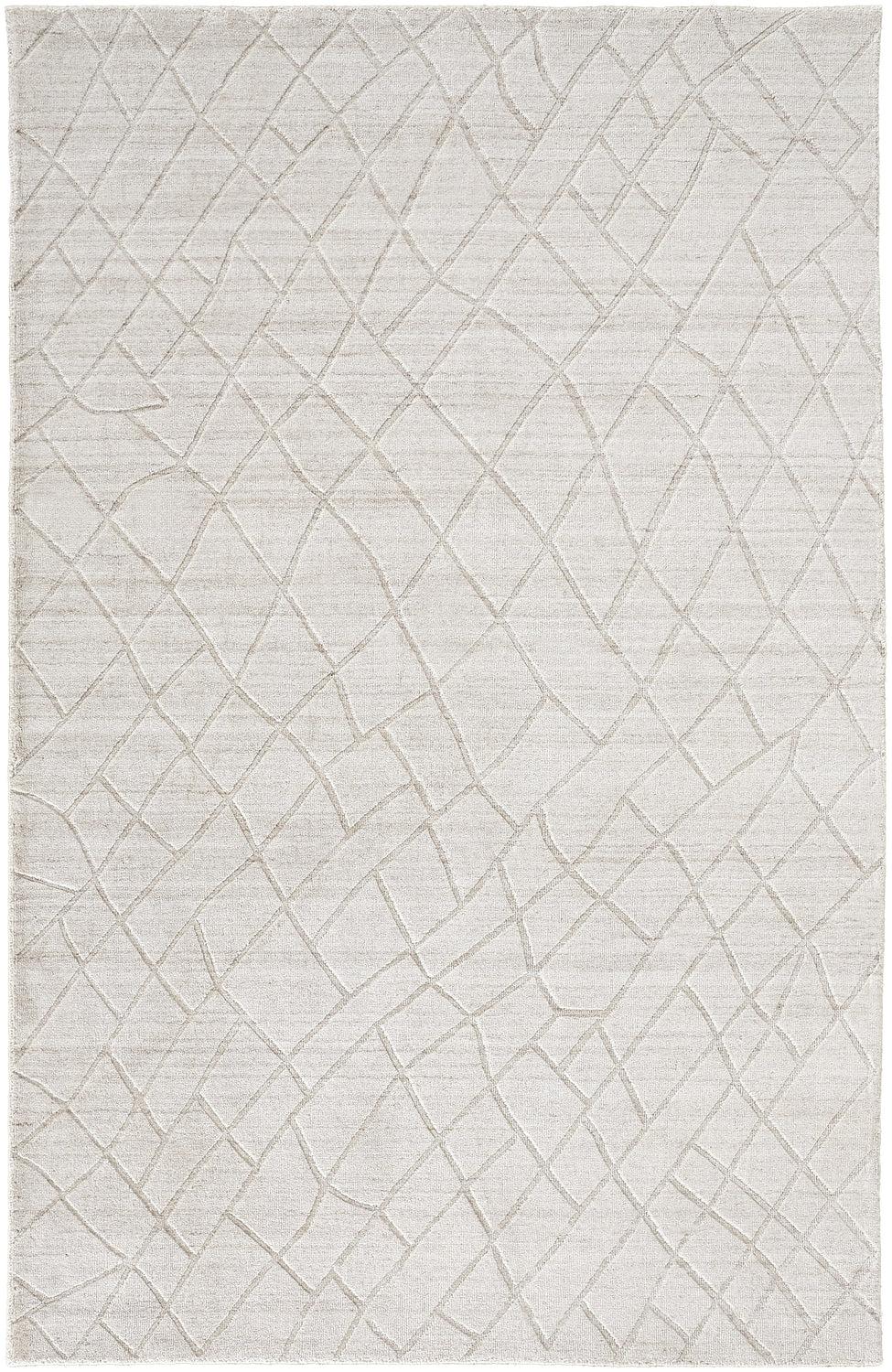 A rectangular low-pile area rug with a soft ivory/cream base and an allover diamond trellis geometric pattern rendered in warm beige and faint gray lines. The diamond outlines have a slightly irregular, hand-drawn quality consistent with handmade construction, creating a subtle organic feel within the geometric structure. The surface is smooth and flat with a very slight sheen — indicative of a viscose content in the wool blend — giving the pattern a gentle luminosity. The edges are cleanly bound with no fringe or tassels. The overall visual impression is calm, tone-on-tone, and quietly sophisticated — almost monochromatic but with enough textural variation to hold visual interest.