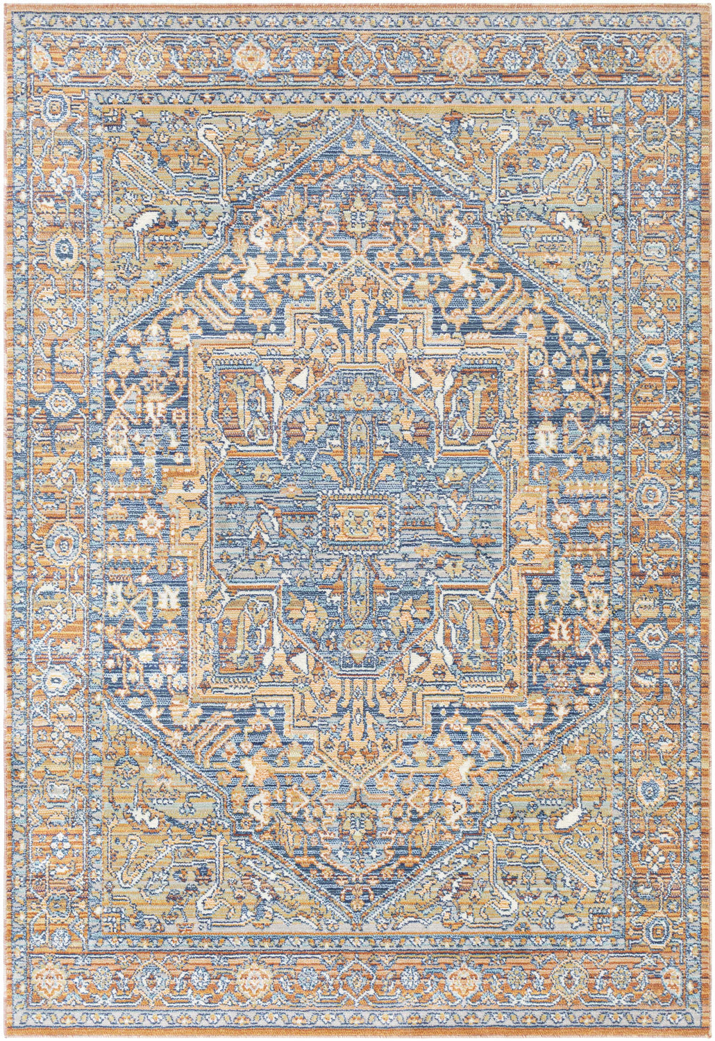 Bring timeless elegance to your home with the Ripponlea Blue&Orange Medallion Area Rug. This updated traditional design features a low pile height that is perfect for high traffic areas and outdoor use. Crafted from polypropylene, it offers durability and comfort. The machine-woven construction ensures this piece will hold up over time, while its subtle pattern provides visual interest. Plus, it's easy to care for - simply spot clean with mild detergent when needed. Add the finishing touch to any room in your home with this beautiful rug!