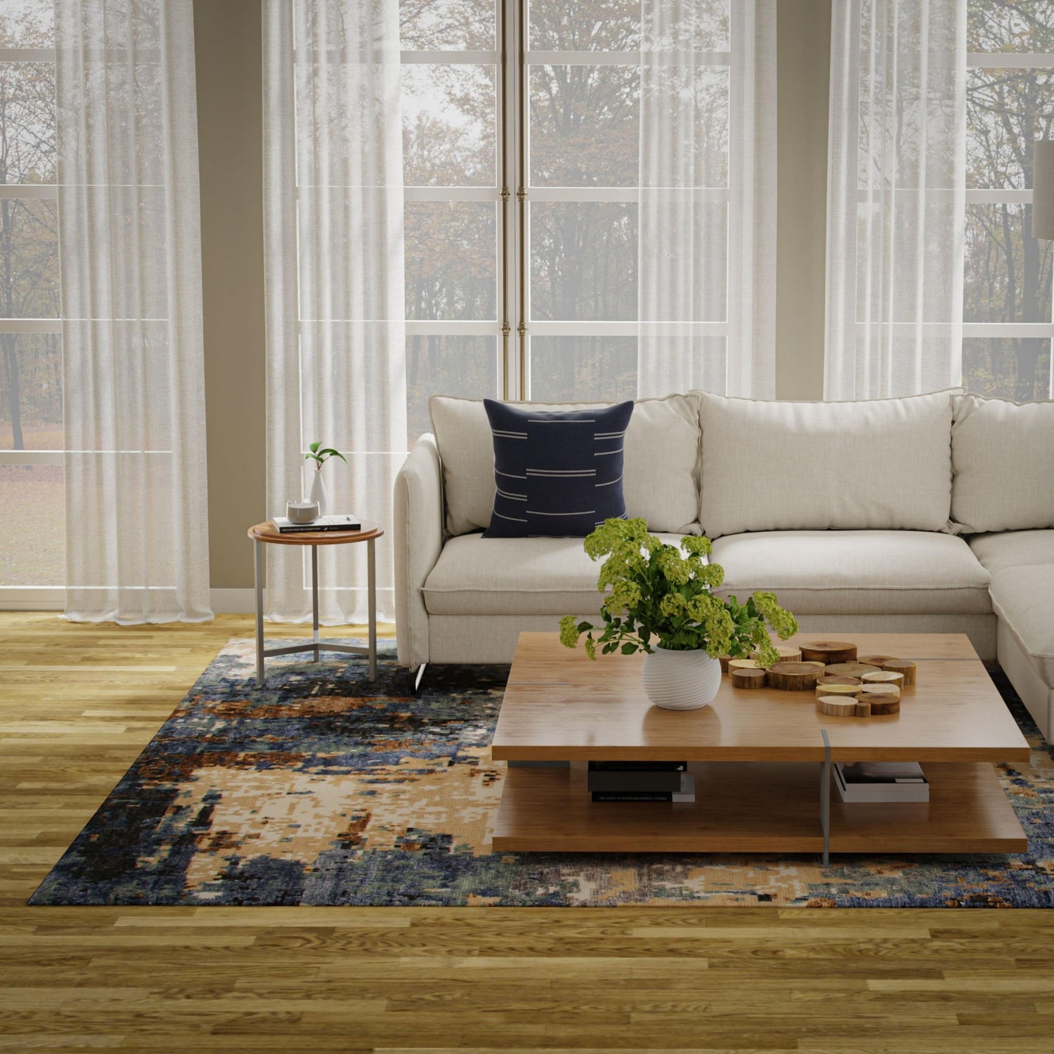 When selecting a living room rug, choose one that anchors your furniture by either placing all the legs on the rug or just the front legs, which helps define the seating area and enhances the room’s acoustics.