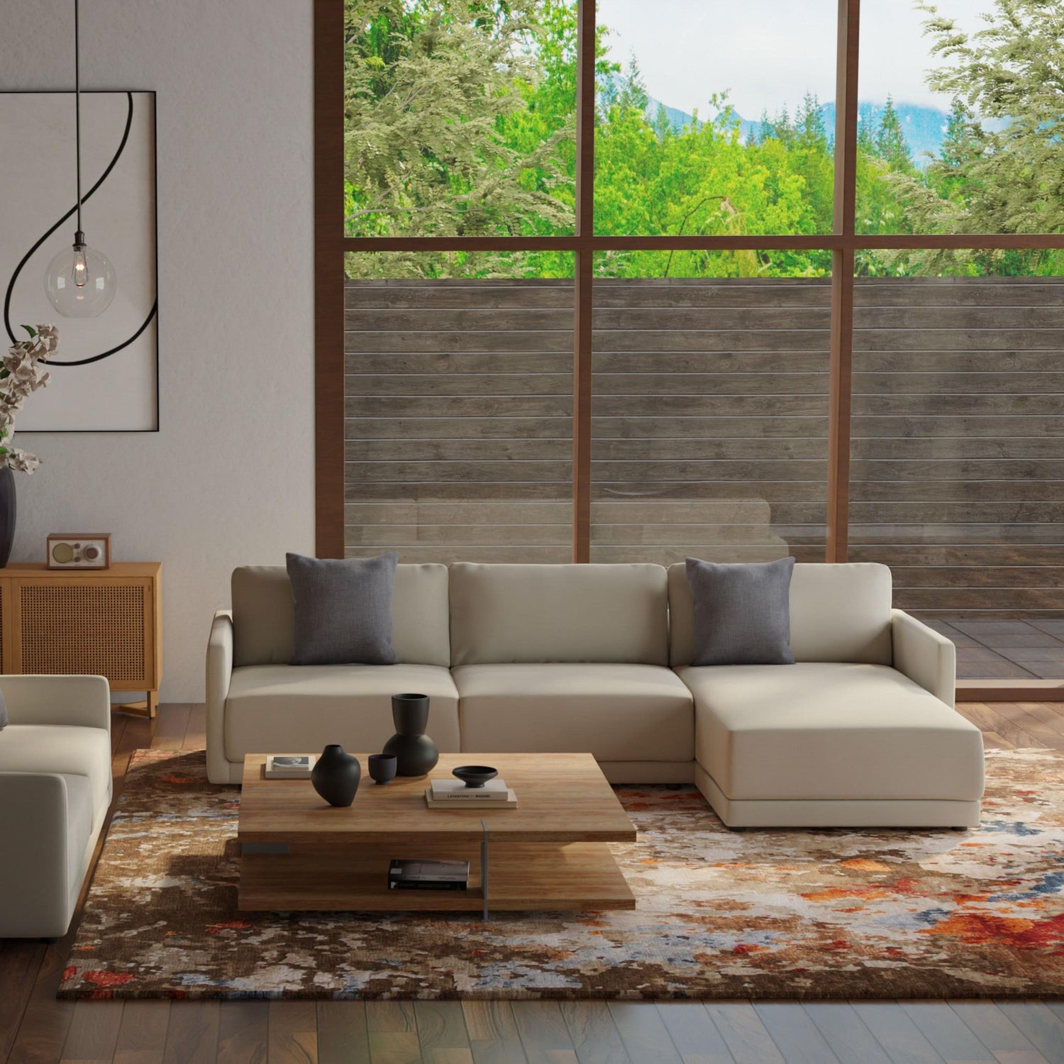 When selecting a living room rug, choose one that anchors your furniture by either placing all the legs on the rug or just the front legs, which helps define the seating area and enhances the room’s acoustics.