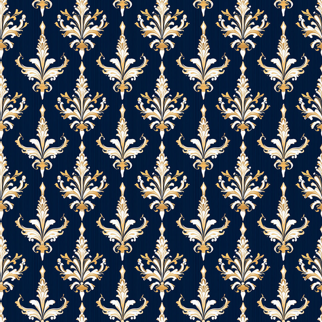 Evoke a sense of timeless elegance with this stunning damask wallpaper. The intricate gold and cream flourishes stand out dramatically against a deep navy blue, textured background, creating a look of pure opulence, ideal for a feature wall in a dining room or master bedroom.