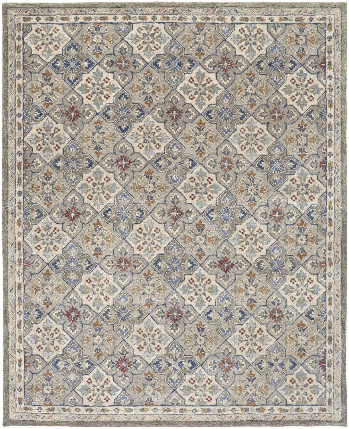 neutral paletteA warm taupe and gray base is layered with ivory diamond panels, each filled with delicate floral motifs in dusty blue, muted red, and soft brown — creating an earthy, multi-tonal palette that feels grounded and quietly rich.