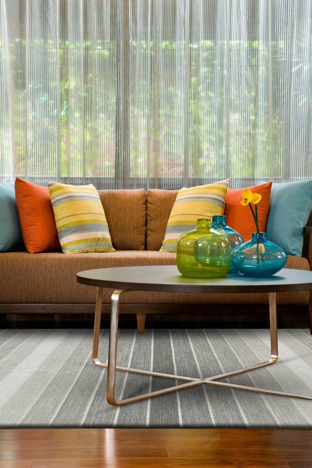 When selecting a living room rug, choose one that anchors your furniture by either placing all the legs on the rug or just the front legs, which helps define the seating area and enhances the room’s acoustics.