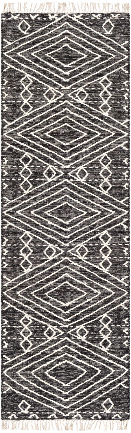 This one-of-a-kind Skedee Black/Cream Diamond Area Rug is a perfect way to add global flair to any room. Constructed from a blend of wool and cotton, this high/low rug features hand woven construction for durability. Its no pile design ensures that it will stay in place for years to come. This beautiful rug has a fringe and is made in India. Use with a rug pad (not included) for added comfort and stability. Spot clean only as needed. Add this unique piece to your home today!