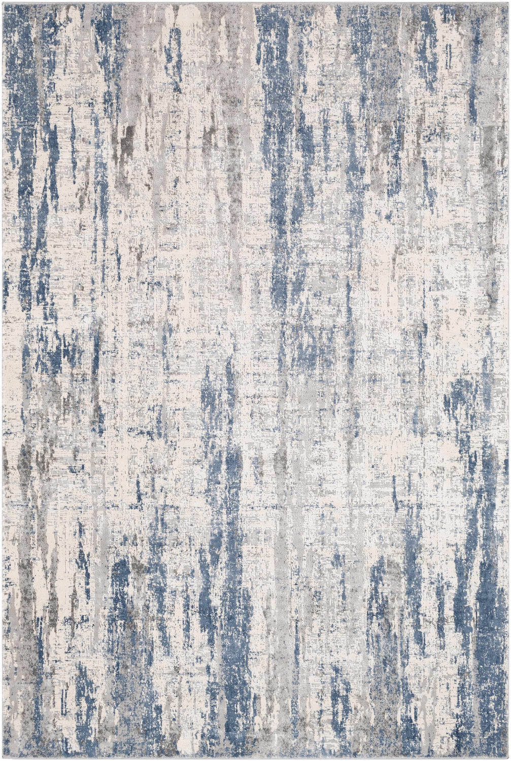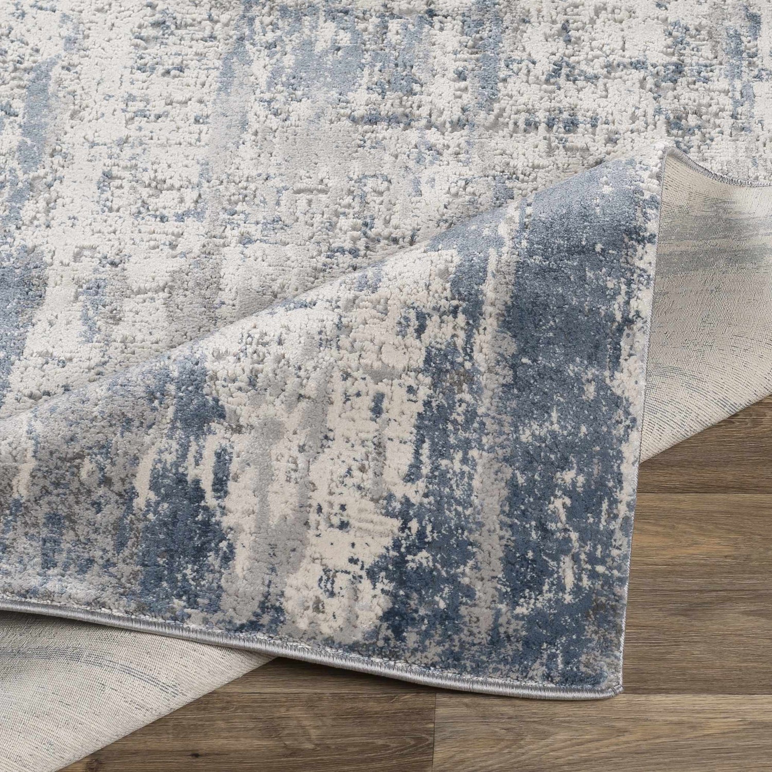 Sweeping blue and gray abstract brushstrokes give the Skidby a cool, artistic edge — a modern statement rug that works hard in high-traffic spaces.