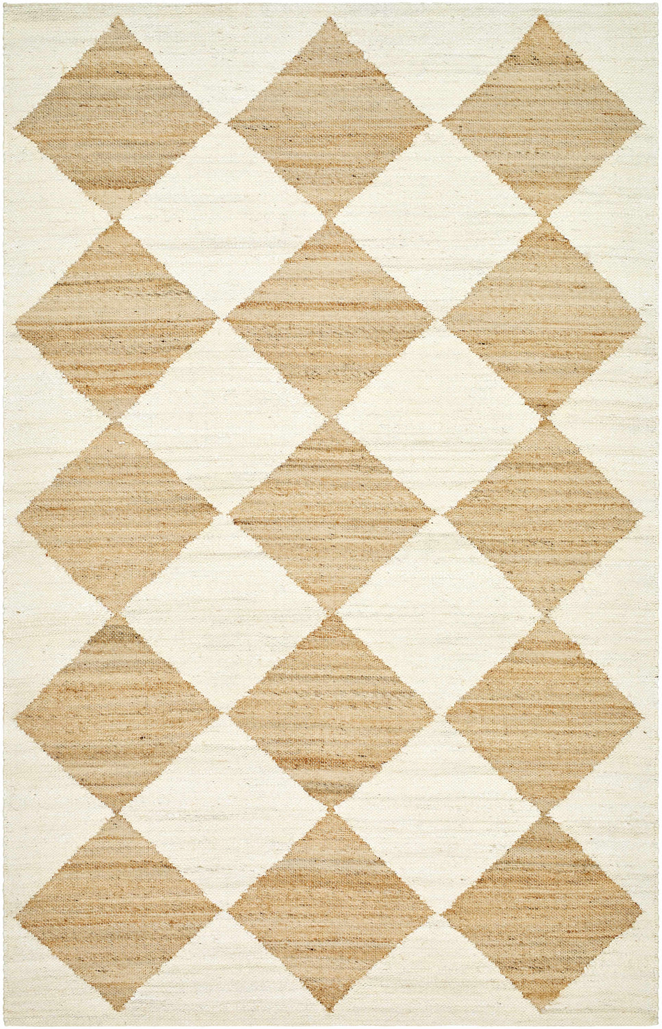 Bold diamond pattern in warm beige and cream, hand woven from natural jute and cotton — a flatweave that's as graphic as it is grounded.