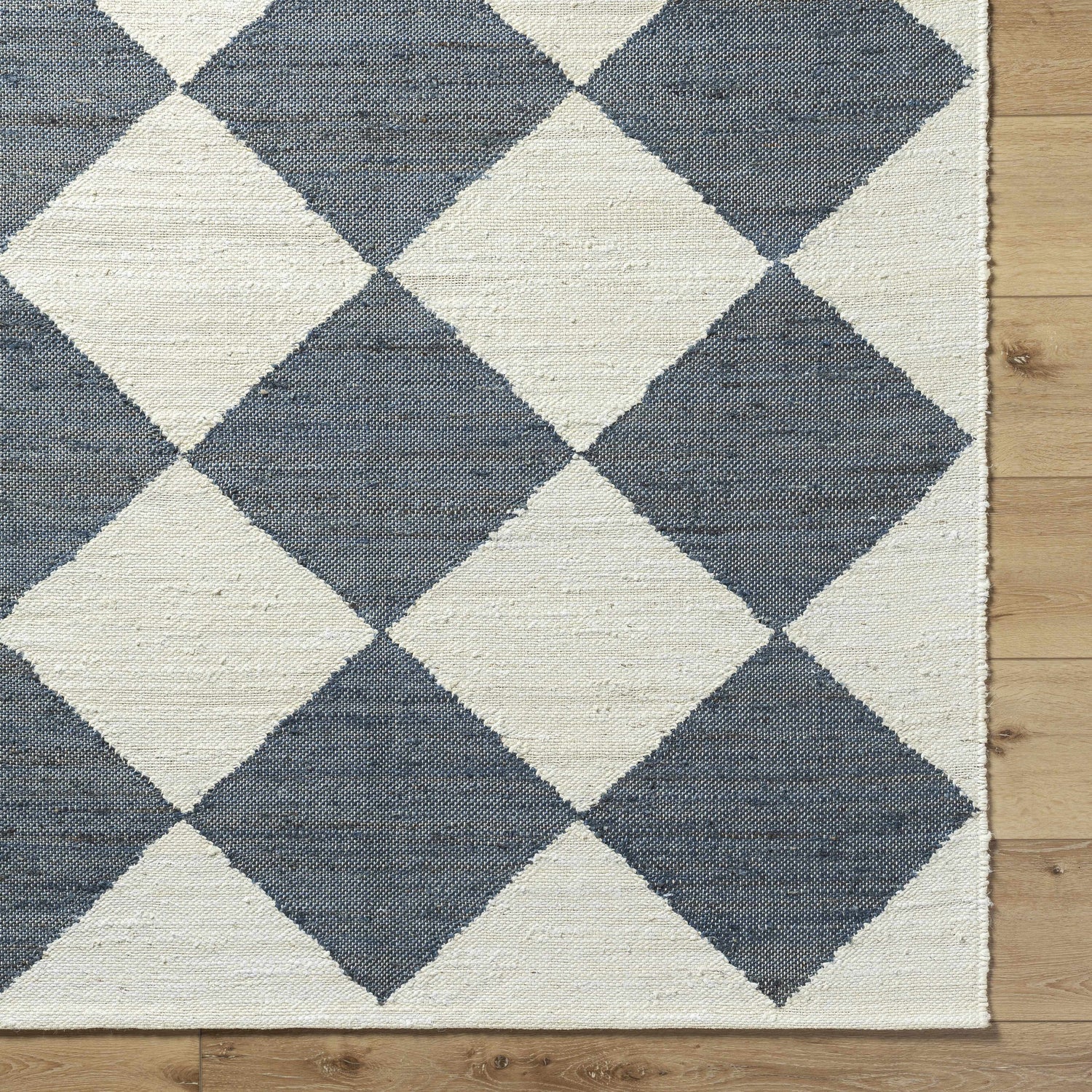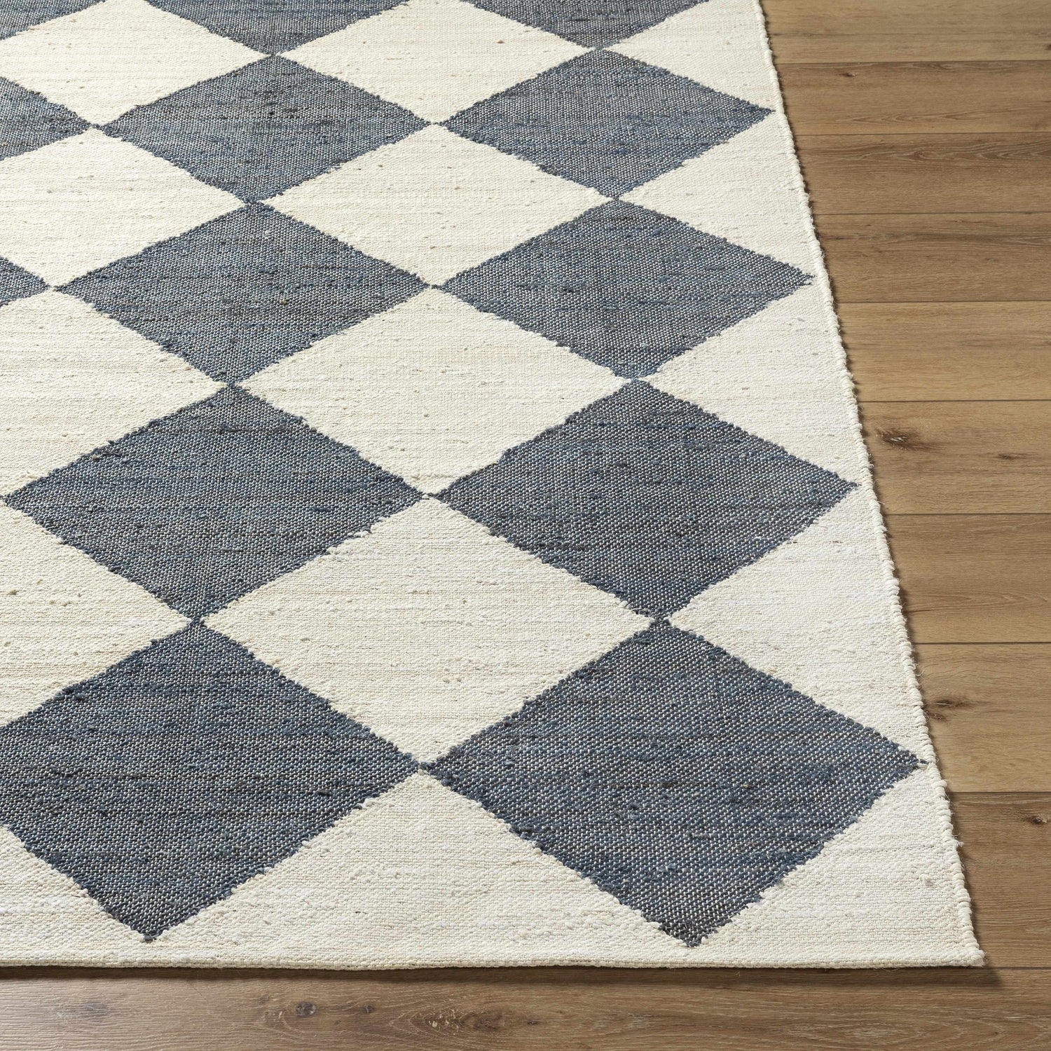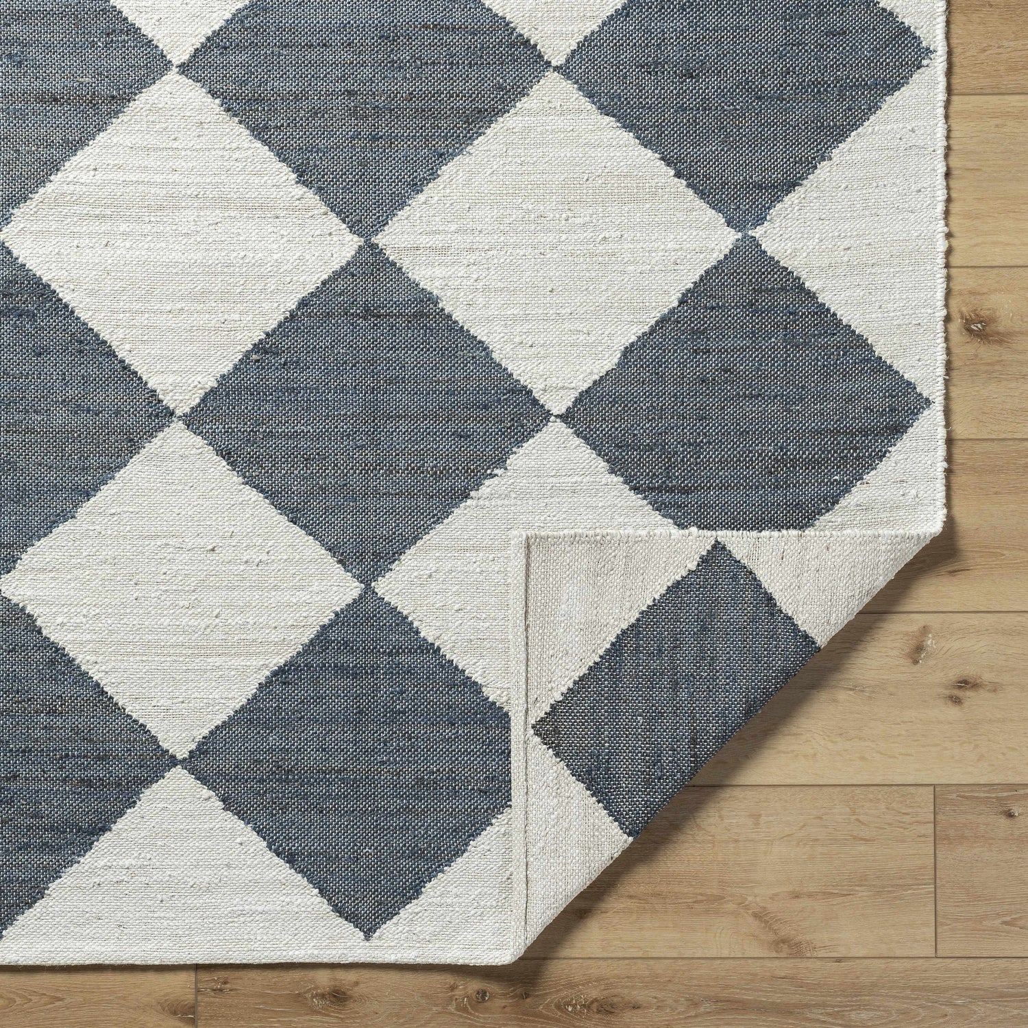 The Sondo Off White Area Rug brings a bold, graphic energy to any room with its striking blue and cream diamond checkerboard pattern. Hand woven from a blend of 100% jute and cotton, this flatweave rug has a natural, textured surface that feels grounded and authentic underfoot. The alternating slate-blue and off-white diamonds are arranged in a classic harlequin layout — simple enough to feel modern and clean, yet visually impactful enough to anchor a room. At just 0.4 inches thick, it lays flat beautifully and works well in high-traffic areas like entryways, dining rooms, and living rooms. The natural fiber construction gives it an earthy, organic quality that pairs effortlessly with both contemporary and farmhouse interiors. Whether you're layering it over a larger neutral rug or letting it stand alone on hardwood floors, the Sondo's two-tone palette makes it incredibly versatile. It's a handmade piece with real character — the kind of rug that looks intentional and considered without trying too hard.