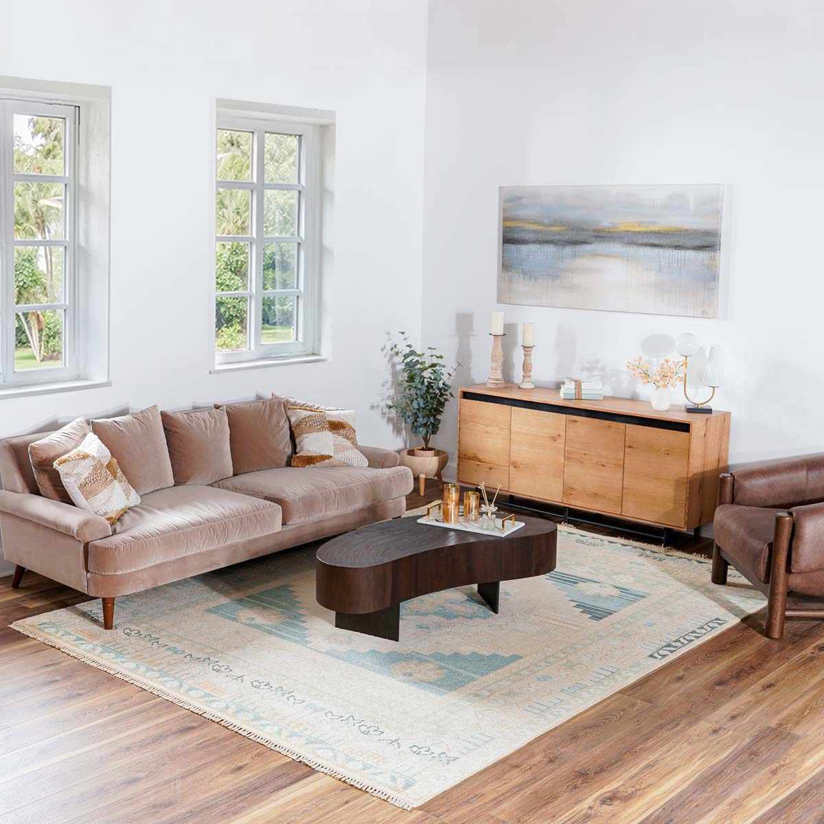 When selecting a living room rug, choose one that anchors your furniture by either placing all the legs on the rug or just the front legs, which helps define the seating area and enhances the room’s acoustics.