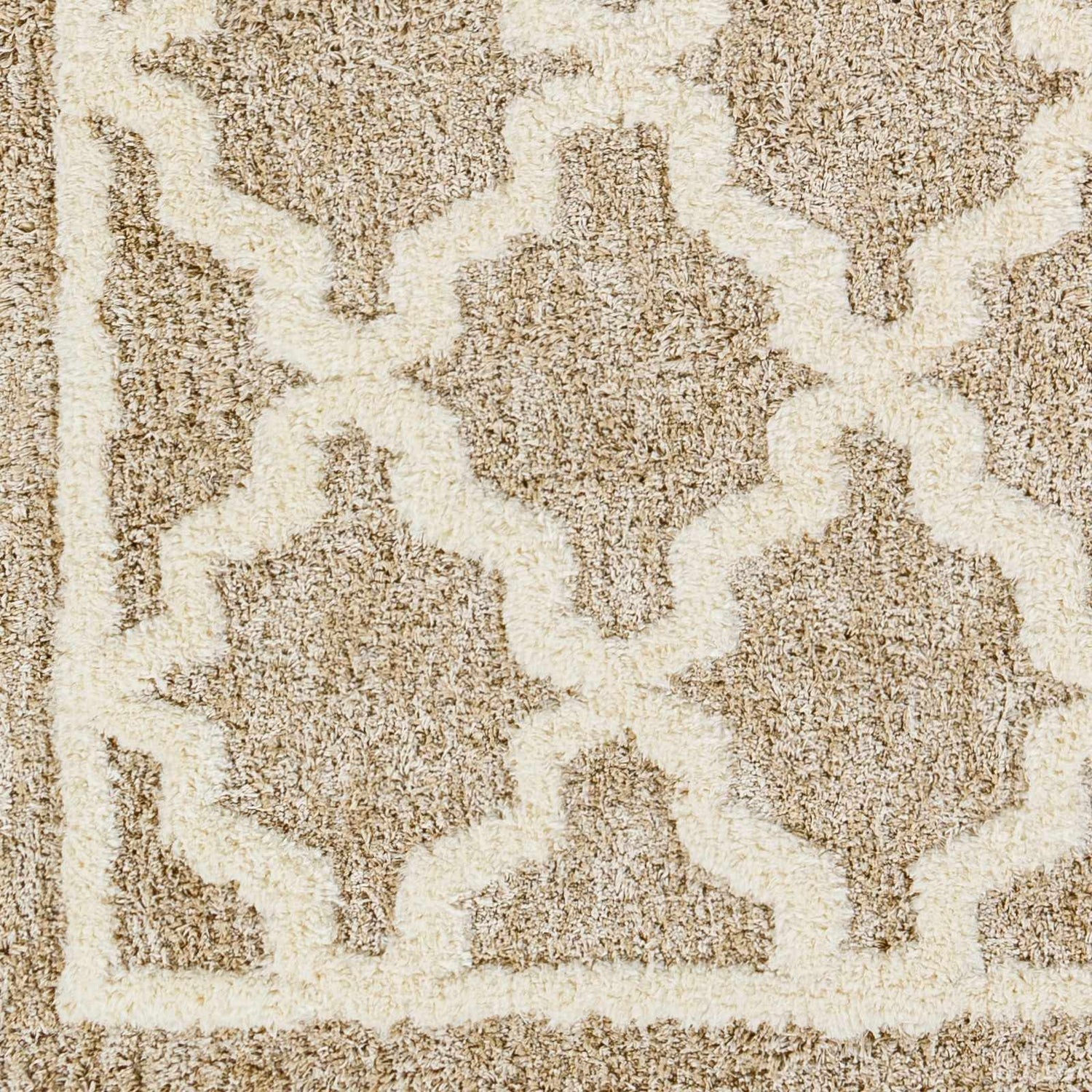 A warm tan and cream Moroccan trellis pattern with a thick, plush polyester pile — neutral enough for any room, stylish enough to be the focal point.