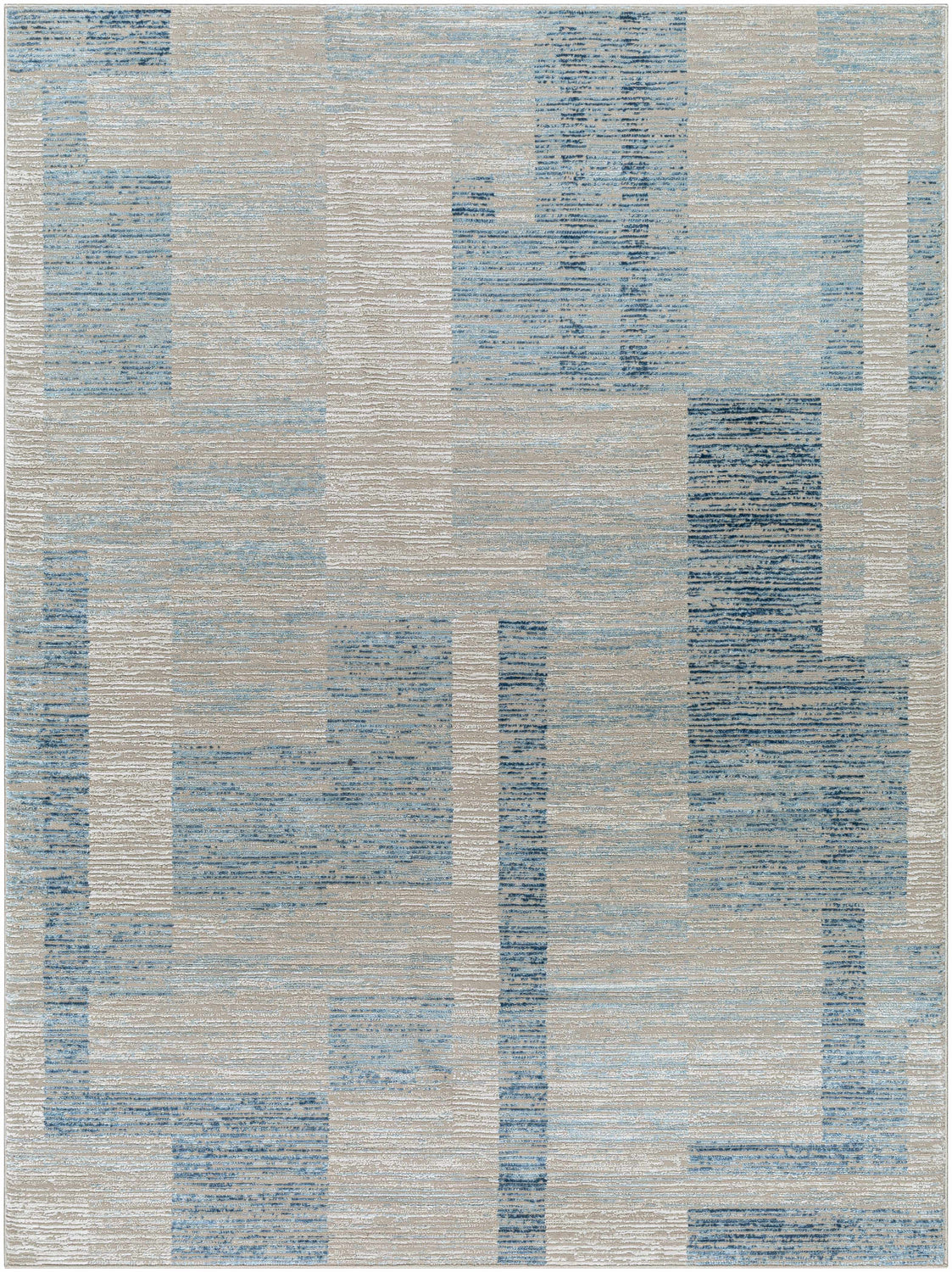 - Bold geometric block pattern in layered blues, grays, and beige