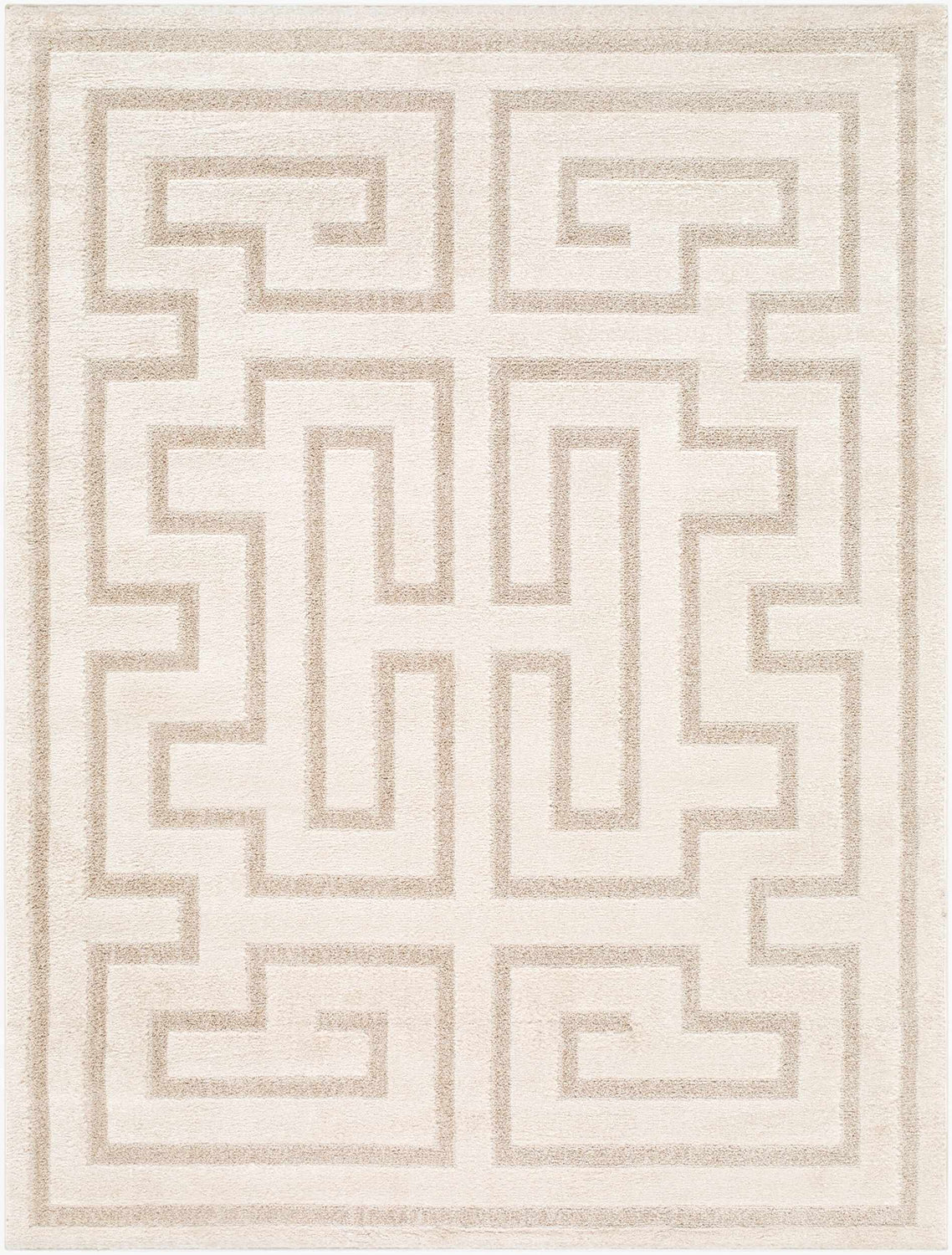 A rectangular area rug with a cream/ivory base and warm taupe Greek key geometric pattern covering the entire field in a symmetrical, interlocking maze-like design. The Greek key motif is rendered in a slightly deeper taupe against the lighter cream ground, creating a tone-on-tone effect that is subtle yet visually structured. A clean geometric border in matching taupe frames the outer edge of the rug, reinforcing the pattern's architectural quality. The surface has a smooth, low-to-medium pile with a machine-woven texture — no fringe, no tassels, bound edges. At a glance, the rug reads as a soft cream with a quietly bold geometric pattern that feels both modern and timeless.