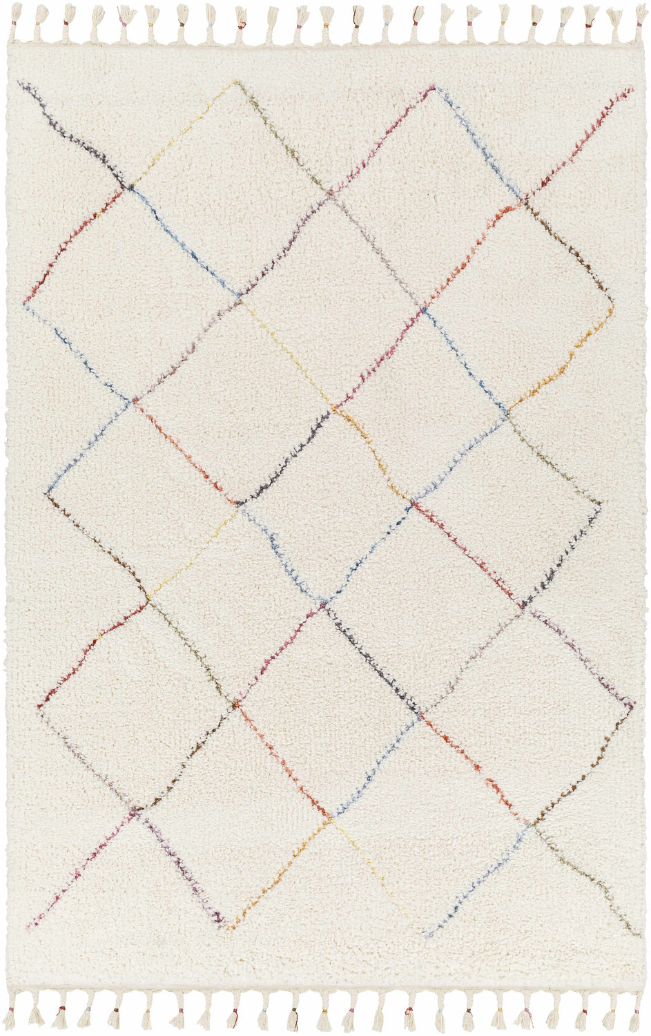 | About: | This white plush rug is perfect for kids rooms or bedrooms and will bring a smile to your face every time you walk on it. The geometric pattern features colorful straight lines creating a trellis pattern, giving your room a splash of extra color and fun style. Plus, we added tassels on each side for some extra flair; it all comes together for an eye-catching look that will add excitement to your home! |