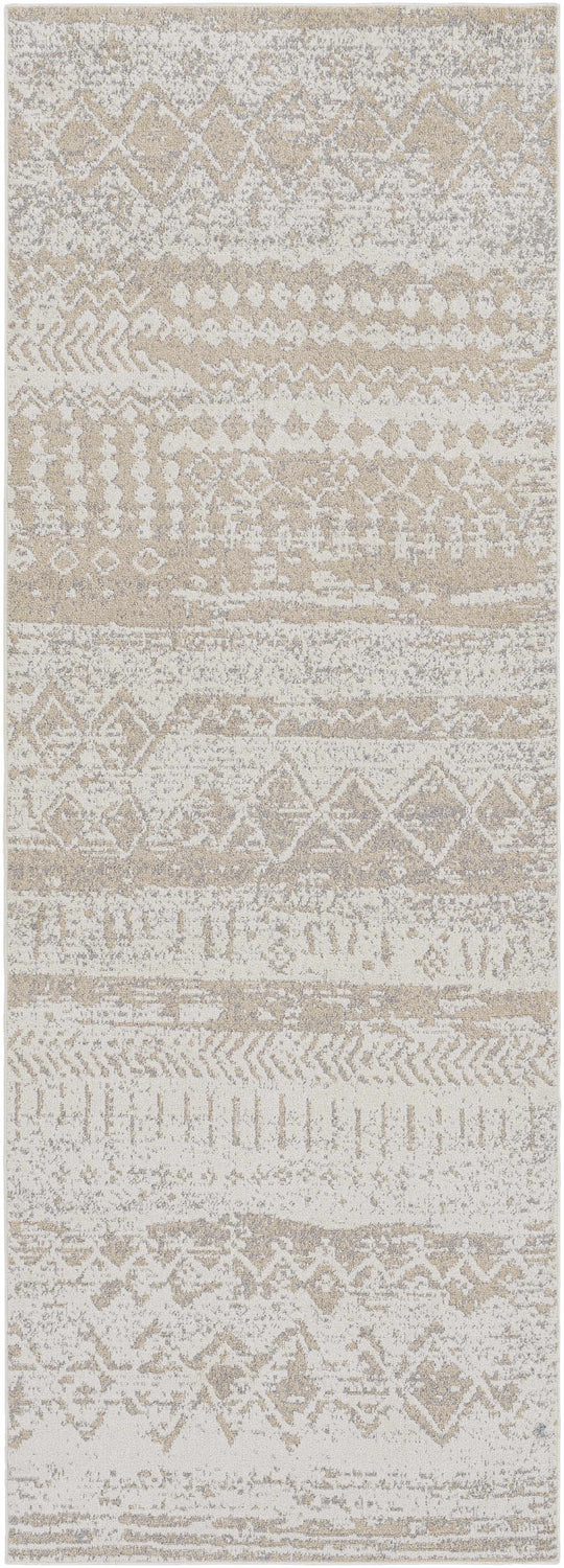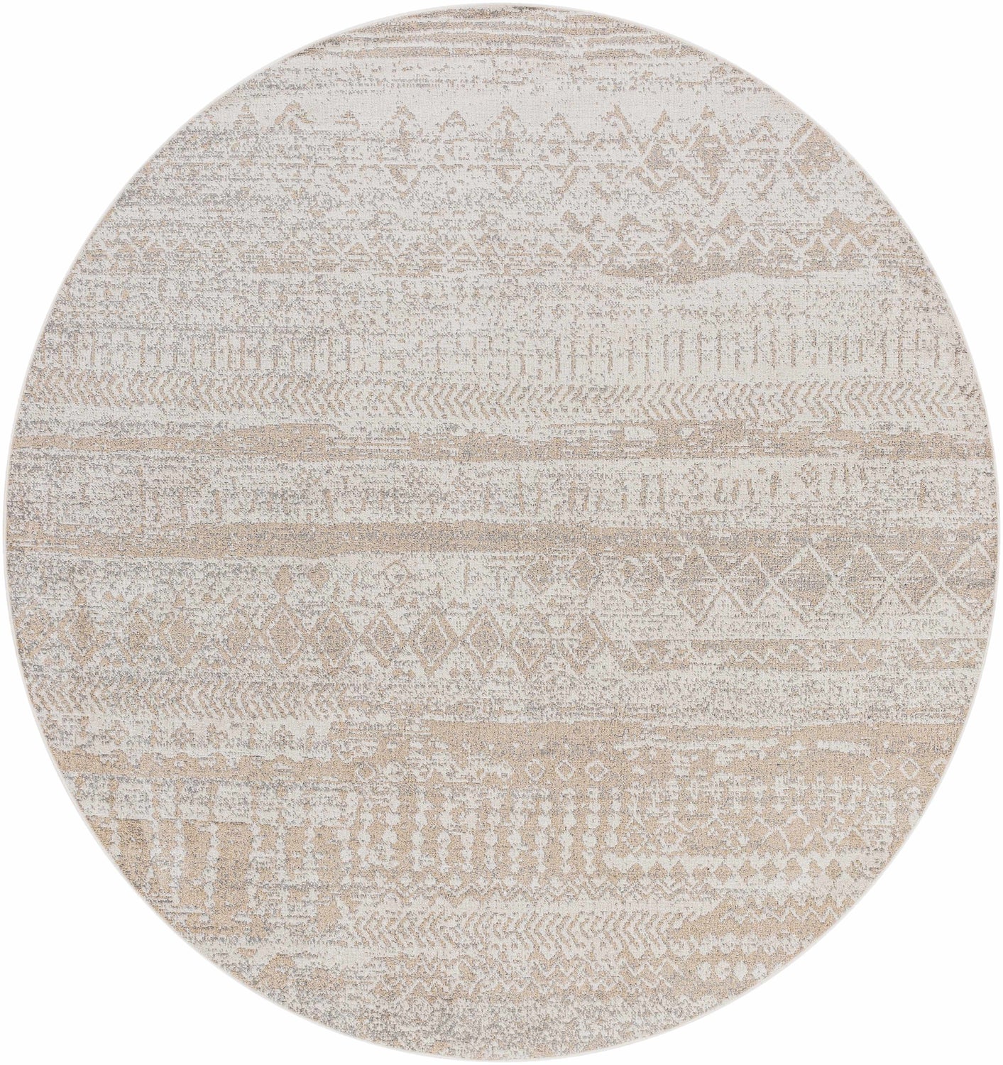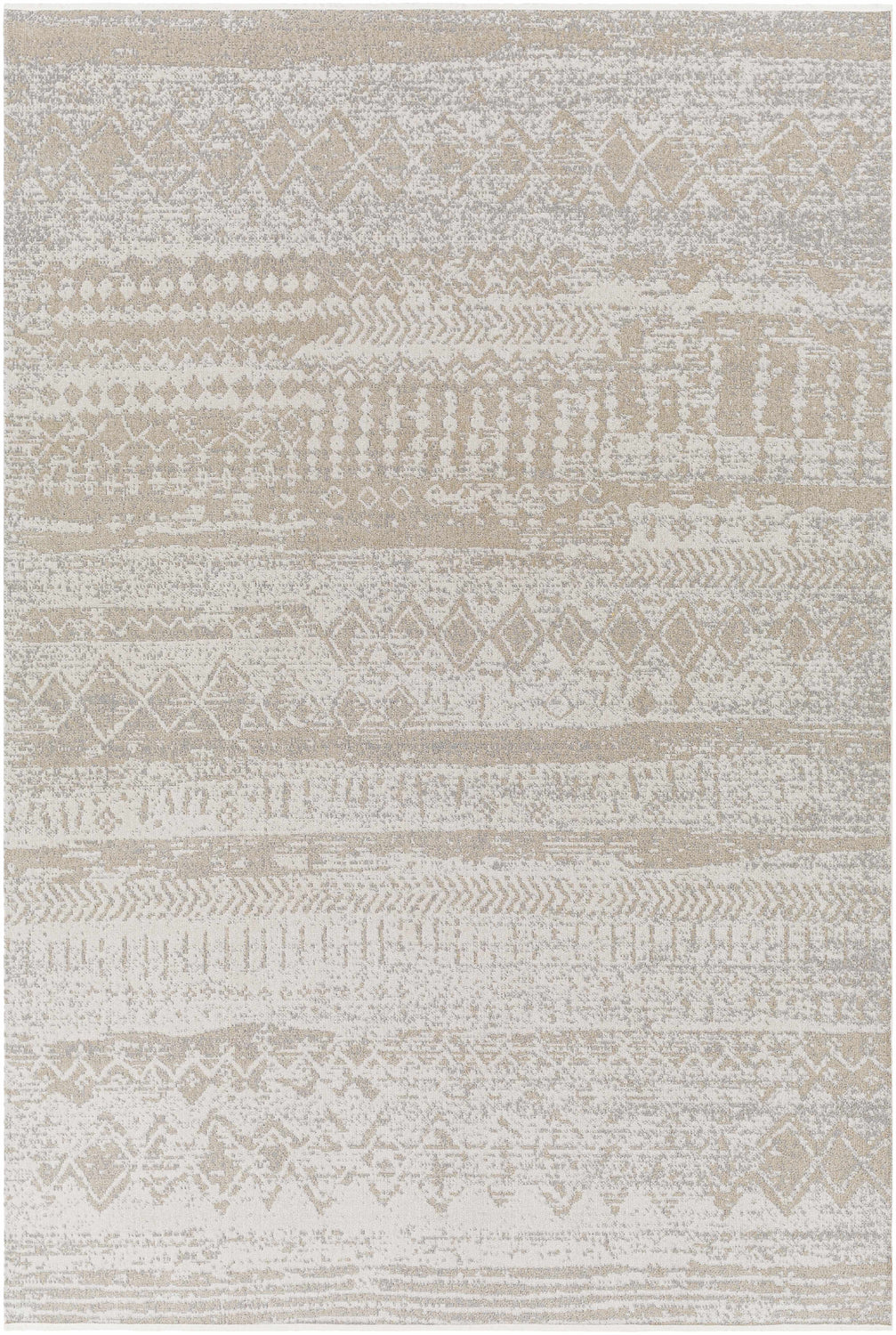 A rectangular low-pile area rug with a warm sandy beige base and layered horizontal bands of tribal geometric motifs in cream and soft gray. The pattern features repeating rows of small diamonds, arrow-like chevrons, dotted lines, and abstract tribal marks arranged in alternating horizontal registers across the full field — no border, the pattern runs edge to edge. The surface has a slightly distressed, washed appearance with subtle tonal variation that gives it a relaxed, lived-in quality. The pile is very flat and smooth with a tight machine-woven texture. Edges appear cleanly bound with no visible fringe in the image despite metadata noting fringe. The overall impression is of a calm, sun-bleached Moroccan-tribal textile in a completely neutral, versatile palette.