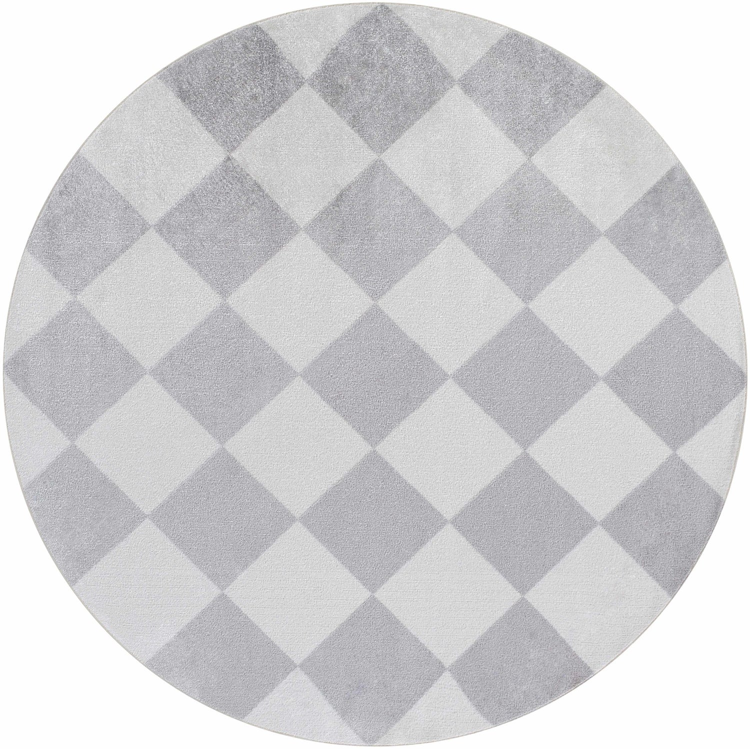 A rectangular area rug with an allover diamond checkerboard pattern composed of large rotated squares arranged in a repeating grid. Alternating diamonds are filled with soft light gray and warm cream/off-white, creating a clean two-tone geometric design with no border or additional ornamentation. The surface is smooth and low-pile with a machine-woven texture — flat and tight with a subtle sheen from the polyester fibers. The edges are cleanly bound with no fringe or tassels. At a glance, the rug reads as a classic harlequin or argyle-style diamond grid in a cool gray and warm cream colorway, simple and graphic.
