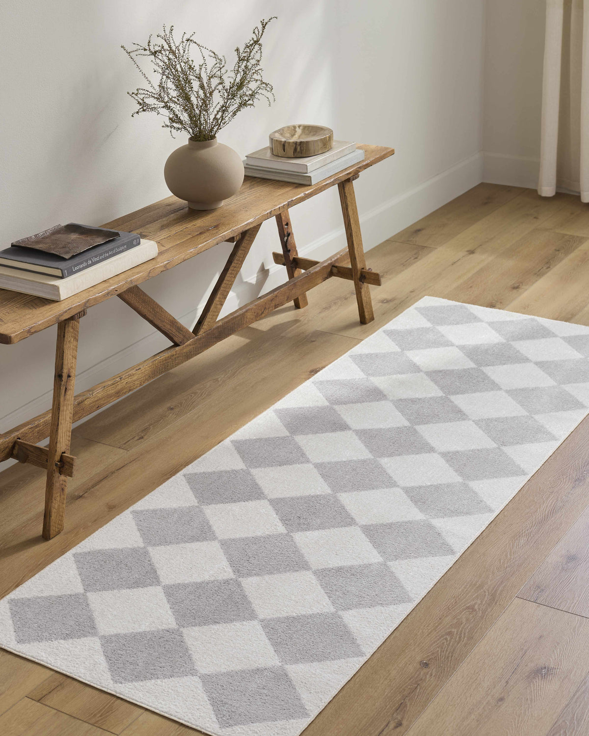 cool paletteA soft light gray dominates the diamond shapes against a warm cream background, creating a two-tone palette that feels airy and understated — cool enough to feel modern, neutral enough to work anywhere.