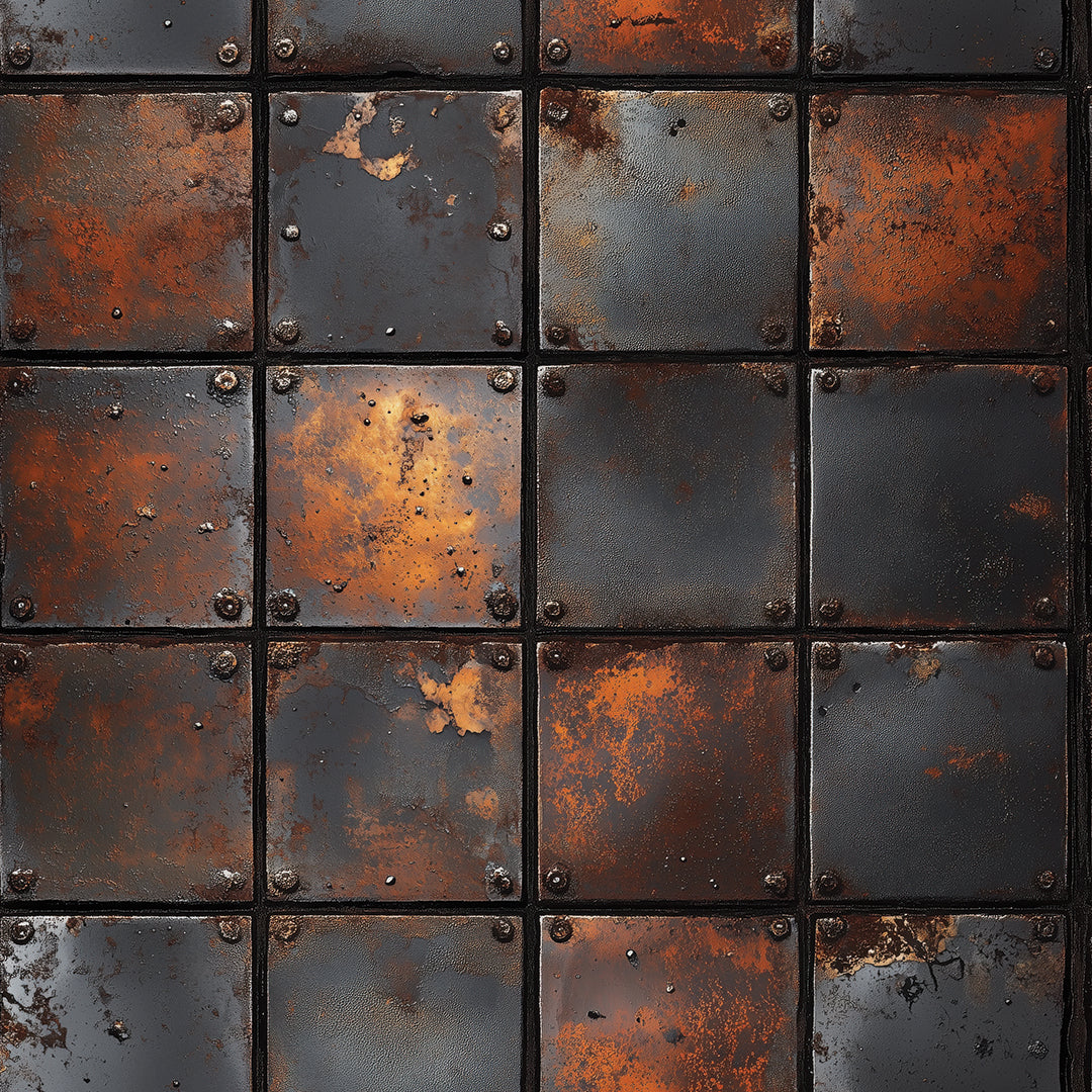 Embrace a raw, industrial aesthetic with these riveted steel panels. The design showcases a dynamic interplay of weathered charcoal and fiery rust textures, creating a bold, masculine statement perfect for an accent wall in a study or loft.